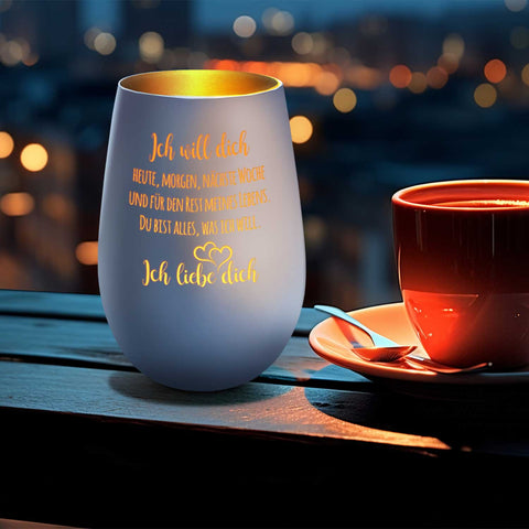 Dieses wunderschöne Windlicht mit der berührenden Gravur 'Du fehlst Gestern. Heute. Morgen. Immer.' ist mehr als nur eine Deko - es ist ein Zeichen der Erinnerung und Verbundenheit. In elegantem Weiß mit Bronze-Akzenten im Inneren schafft es eine ganz besondere Atmosphäre. Mit 120 mm Höhe und 85 mm Durchmesser ist es perfekt für den Esstisch, die Kommode oder jeden anderen Platz, an dem du ein wenig Trost und Wärme brauchst. Die präzise Lasergravur kombiniert mit einem Teelicht zaubert magische Lichteffekte an die Wand. Ob als tröstendes Geschenk in schweren Zeiten oder einfach als Ausdruck des Gedenkens - dieses Windlicht ist ein einfühlsamer Begleiter. Es verleiht jedem Raum eine gemütliche Note und erinnert an die Menschen, die uns wichtig sind. Ein zeitloses Stück, das nicht nur schön aussieht, sondern auch Bedeutung trägt.