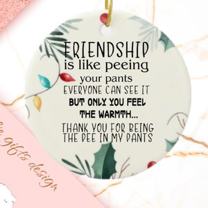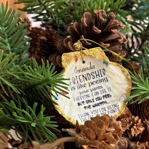 'Friendship Is Like Peeing On Yourself' - dieser lustige Spruch bringt garantiert Schmunzler in deine Weihnachtsdekoration! Die weiße Porzellan-Schneeflocke (7,3cm) ist beidseitig bedruckt und hat eine makellose Glasur. Perfekt, um das verrückte Jahr 2020 in Erinnerung zu behalten oder einfach als witziges Geschenk für beste Freunde. Mit dem beigefügten Aufhängeseil schnell am Christbaum, am Fenster oder sogar an der Schultasche befestigt. Das Design ist einzigartig und sorgt für Gesprächsstoff bei jeder Weihnachtsfeier. Ideal als Geschenk für Mutter, Vater, Geschwister oder den besten Freund. Hergestellt in den USA mit Liebe zum Detail. Ob als Teil deiner Weihnachtssammlung oder als Hauptattraktion am Baum - dieses Ornament ist etwas Besonderes. Ein humorvoller Blick auf Freundschaft, der zeigt, dass man sich auch in schwierigen Zeiten nahe ist. Perfekt für alle, die Weihnachten mit einem Augenzwinkern feiern!