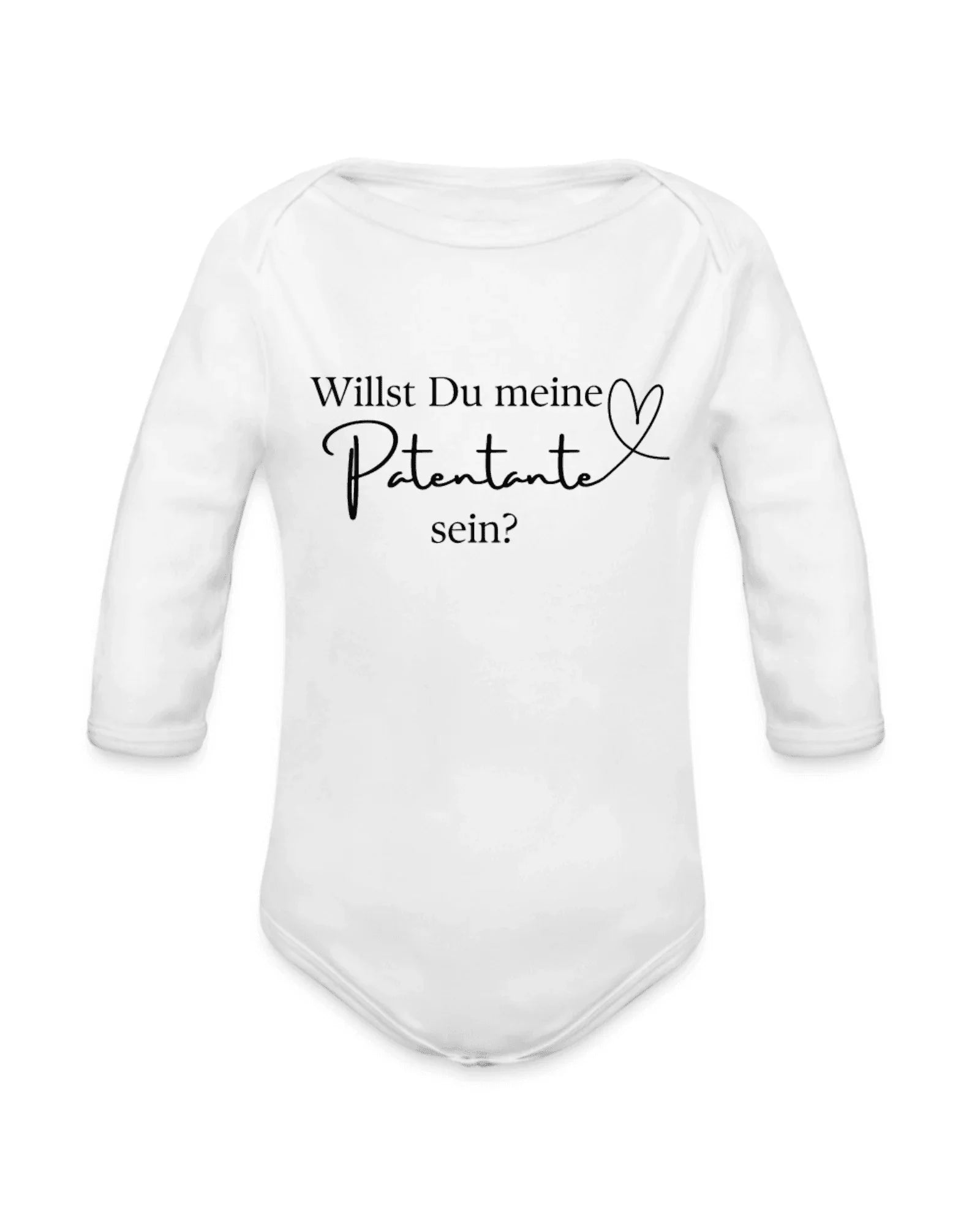 Oh wie süß! Dieser Langarm-Body für Babys ist einfach perfekt für die kalten Tage. Mit dem niedlichen Aufdruck 'Willst du meine Patentante sein?' in Marine ist er ein ideales Geschenk zur Paten-Ankündigung. Hergestellt aus 100% gekämmter und ringgesponnener Bio-Baumwolle ist er super weich und angenehm auf der zarten Babyhaut. Der Envelope-Halsausschnitt und der elastische Stoff ermöglichen maximale Bewegungsfreiheit - genau das, was kleine Entdecker brauchen! Die nickelfreien Druckknöpfe am Beinausschnitt sind gesundheitlich unbedenklich und machen das An- und Ausziehen super easy. Pflegehinweis: Am besten bei max. 30°C auf links waschen und bei mittlerer Temperatur bügeln. So hält der Body lange und sieht immer top aus!
