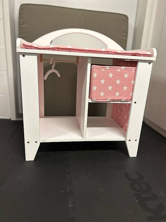 Wie süß ist das denn? Diese komplett ausgestattete Wickelstation für Puppen macht jedes Kinderherz höher schlagen! Alles in einem: Wickeltisch mit weicher Bettwäsche, niedlicher Hochstuhl mit Kissen, Waschbecken mit Duschkopf und jede Menge Stauraum. Das funkelnde Sternen-Mobile über dem Wickeltisch unterhält die Puppe beim Windelwechsel. Perfekt für 38-46 cm große Puppen - kompatibel mit Our Generation, Melissa & Doug, Baby Born und vielen anderen Marken. Aus robustem, sicherem Holz und Polyester-Leinen. Einfach mit feuchtem Tuch abwischen. Macht nicht nur irre Spaß, sondern bringt den Kleinen auch wichtige Fähigkeiten bei: Anziehen, Füttern, Saubermachen. Maße: 57,8x48,3x97,8 cm - genau die richtige Größe für kleine Puppenmuttis. Leicht aufzubauen mit beiliegender Anleitung. Olivia's Little World steht für qualitativ hochwertiges, sicheres Spielzeug mit liebevollen Details. Ab 3 Jahren geeignet - ein Traum für jede kleine Puppenmama!