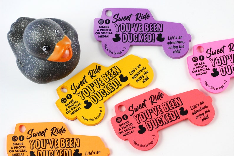You've Been Ducked - das lustige Spiel, das gerade alle begeistert! Dieses Set enthält 20 gelbe 3D-Gummienten, 20 schwarze Entenanhänger-Karten (6,3x6,3cm) und 20 Gummibänder. Einfach die personalisierbaren Tags mit deinem Text versehen, an den Enten befestigen und irgendwo verstecken! Mach ein Foto und teile es in den sozialen Medien. Verbreite Lächeln und gute Laune in deiner Nachbarschaft, am Arbeitsplatz oder unter Freunden. Die Entenanhänger haben auf der Rückseite Platz für individuelle Nachrichten - sei kreativ! Perfekt als Geschenk für Entenliebhaber oder einfach für spontane Acts of Kindness. Das Leben ist ein Abenteuer - genieße die Fahrt mit diesen niedlichen Enten! Einfach auspacken, beschriften und losducken! Bring Abwechslung in den Alltag und mach anderen eine Freude!
