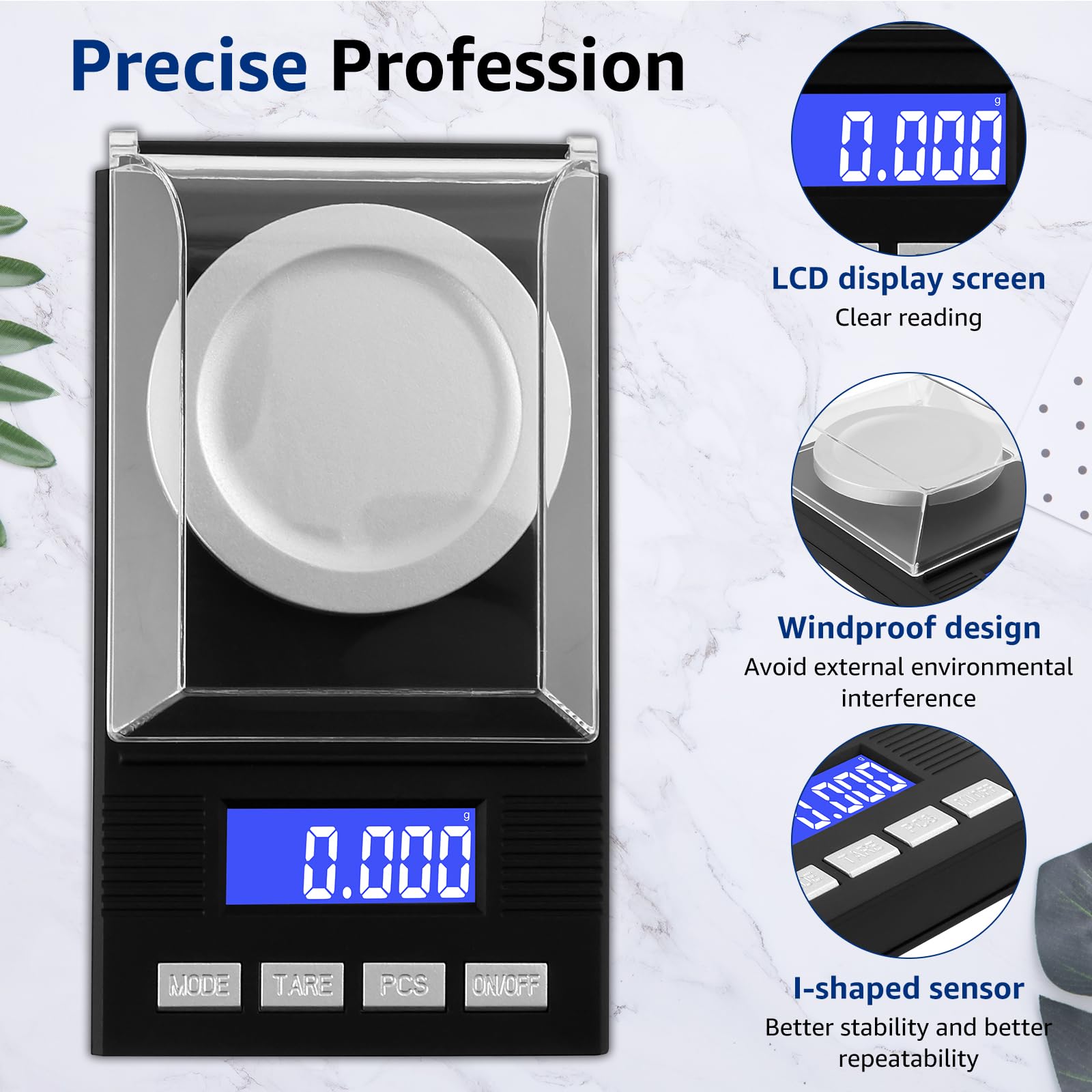 Brauchst du ultra-genaue Messungen? Diese Feinwaage misst bis auf 0.001g genau - das ist so präzise wie in einem Profi-Labor! Mit ihrem winddichten Design kriegst du selbst bei Luftzug stabile Werte angezeigt.\\n\\nDas blaue LCD-Display ist richtig gut ablesbar, auch wenn's mal etwas dunkler ist. Perfekt für alle, die mit kleinen Mengen arbeiten: Ob Goldschmiede, Juweliere, Apotheker oder Hobby-Chemiker. Die Waage wiegt Pulver, Schmuck, Chemikalien - einfach alles bis 50g.\\n\\nIm Lieferumfang findest du alles, was du brauchst: Die Waage selbst (läuft mit 2 AAA-Batterien), Pinzette, Wiegeschale und Kalibriergewicht. Das ABS-Gehäuse ist robust und hält was aus.\\n\\nSuper praktisch: Sie ist nur 11.5 x 6.5 cm klein - passt in jede Tasche. Ob im Labor, in der Werkstatt oder zu Hause, diese Waage liefert dir professionelle Ergebnisse. Einfach einschalten, kalibrieren und loslegen! Die Tasten sind intuitiv bedienbar, auch für Einsteiger kein Problem.\\n\\nWichtig: Stell die Waage immer auf eine stabile, ebene Fläche für genaueste Ergebnisse. Kleine Abweichungen von 0.001-0.005g können vorkommen - das ist völlig normal bei dieser Präzision!