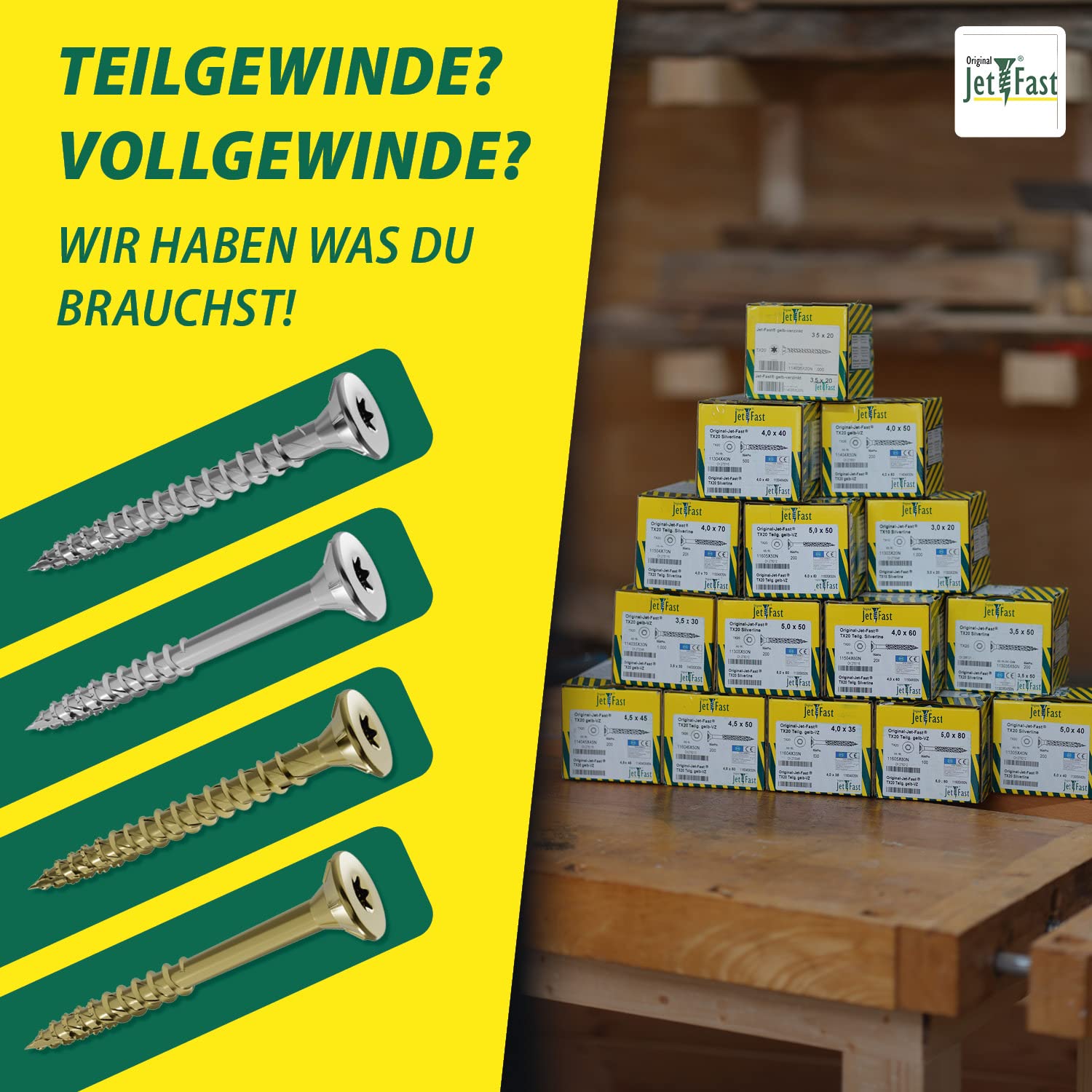 Die Jet-Fast Universalschrauben im 100er-Set sind super für alle Holzprojekte - ob Möbelbau, Regale oder Reparaturen. Mit 5,0x80mm, TX25 Antrieb und Teilgewinde, aus Pro Inox-Material, also rostfrei und langlebig. Der Duo-Senkrippenkopf sorgt für ne glatte, splitterfreie Versenkung, und die selbstbohrende Spitze macht das Einschrauben easy - kein Vorbohren nötig. Das Mehrfachgewinde gibt guten Halt in verschiedenen Holzwerkstoffen und reduziert das Drehmoment. Perfekt für Heimwerker, die Wert auf Qualität und einfache Handhabung legen. Einfach reinschrauben, und sie sitzen bombenfest - kein Wackeln mehr. Spart Zeit und Nerven, und mit 100 Stück hast du lange was davon. Ideal für Garage, Hobbykeller oder Baustelle.