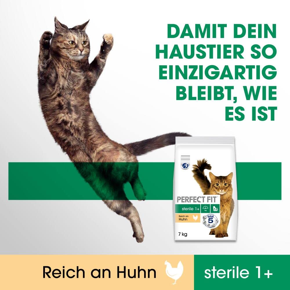 Das perfekte Futter für Ihre sterilisierte Katze ab 1 Jahr! PERFECT FIT wurde von Tierärzten entwickelt, um die besonderen Bedürfnisse kastrierter Samtpfoten optimal zu unterstützen. Mit 14% Huhn und der speziellen Total-5-Formel für rundum Gesundheit.