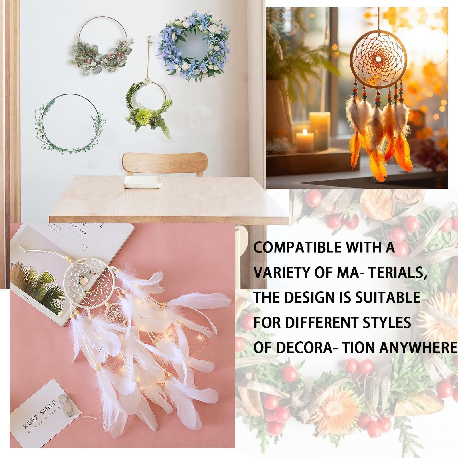 Aus robustem Eisen gefertigt, verformen sich die Ringe nicht und die goldene Beschichtung verblasst nicht. Ob du nun Traumfänger, Hochzeitskränze, Wanddekorationen oder Weihnachtsschmuck basteln willst - mit diesen Ringen geht's leicht!