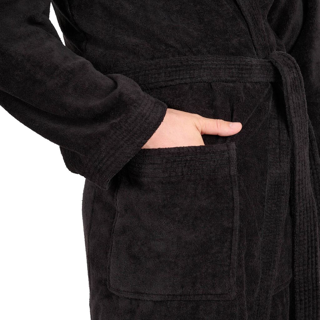Luxus-Comfort für den Herrn! Dieser hochwertige Bademantel aus 100% Baumwolle (400g/m² Frottee) fühlt sich nicht nur unglaublich weich an, sondern saugt Feuchtigkeit auch blitzschnell auf - perfekt nach der Sauna, Dusche oder für entspannte Stunden zuhause. OEKO-TEX zertifiziert und damit garantiert hautfreundlich. Die praktische Kapuze, der verstellbare Bindegürtel und die zwei geräumigen Fronttaschen bieten maximalen Komfort. Der lockere Schnitt ermöglicht uneingeschränkte Bewegungsfreiheit. In klassischem Dunkelgrau erhältlich in den Größen S bis 3XL. Ein Bademantel, der nicht nur gut aussieht, sondern auch langjährige Freude bereitet!