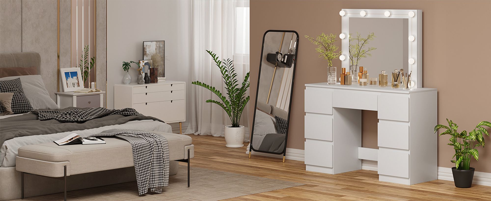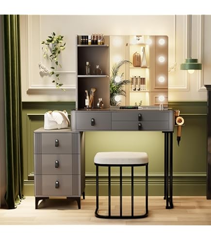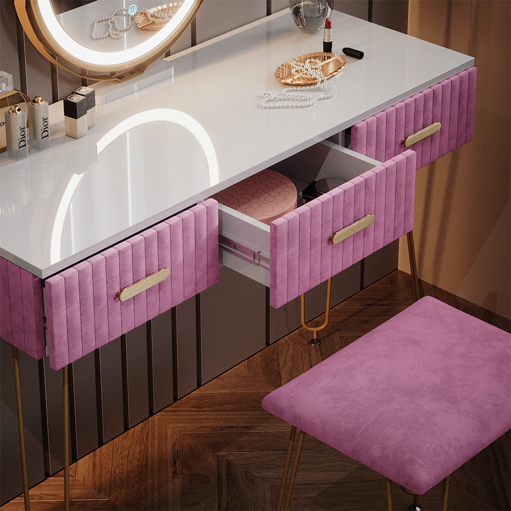 Dieser Vofikoli Schminktisch ist der absolute Traum für jeden Make-up Liebhaber! Mit 100cm Breite bietet er reichlich Platz und kommt inklusive praktischem Hocker. Das Highlight: Die integrierte LED-Beleuchtung mit einstellbarer Helligkeit sorgt für perfektes, schattenfreies Licht beim Schminken. Die 5 Schubladen aus Massivholz bieten genug Stauraum für all deine Kosmetik - mit leisen Schienen und schönen Griffen. Die elektroplattierten Metallfüße sorgen für Stabilität und die abgerundeten Ecken machen ihn auch für Familien sicher. Mehr als nur ein Schminktisch: Er ist eine stylische Kombi aus Schmink- und Schreibtisch für Schlafzimmer oder Wohnbereich. Der inkludierte Hocker ist perfekt auf die Höhe abgestimmt. Einfach aufbauen und sich wie im Beauty-Salon fühlen - professionelles Styling jetzt auch zuhause!