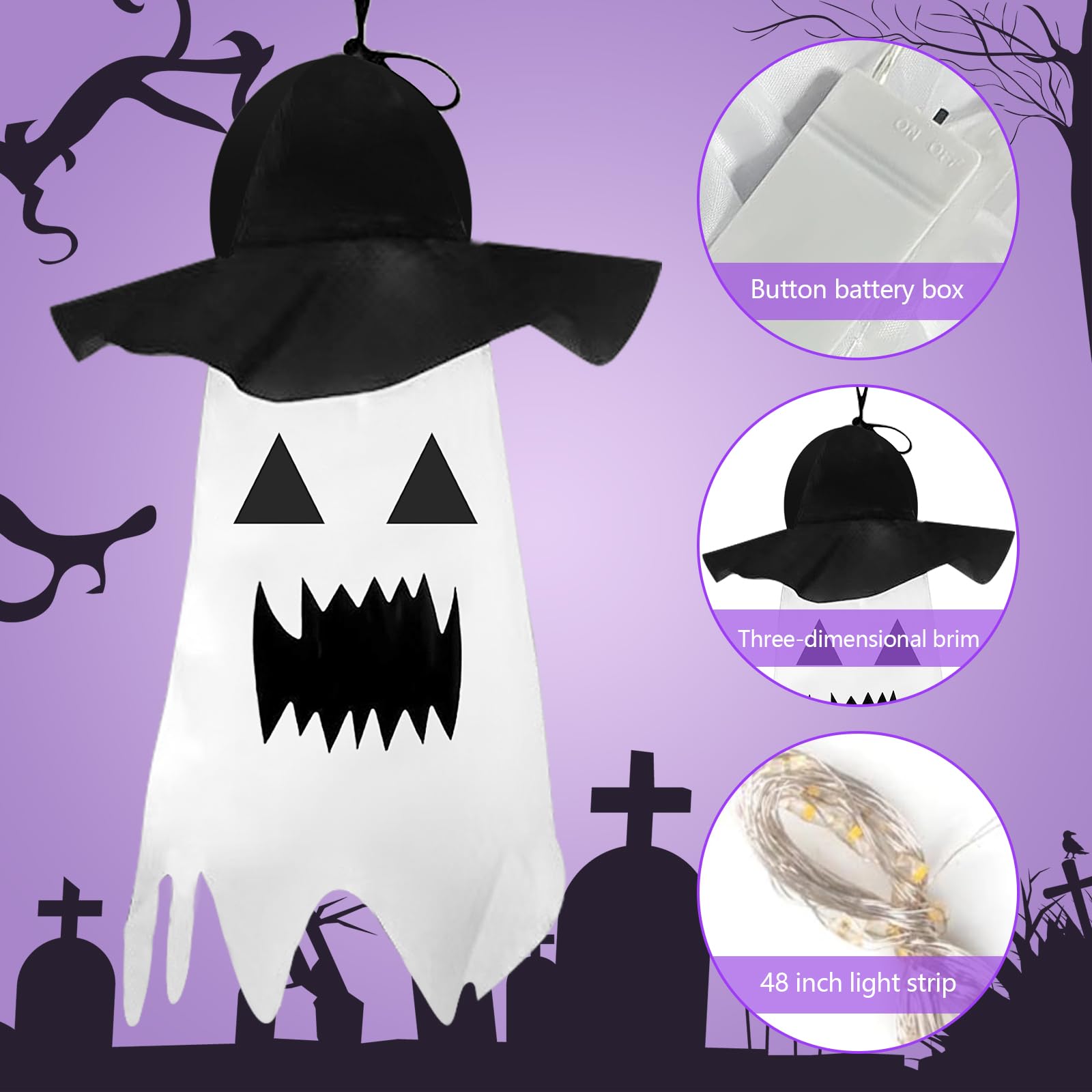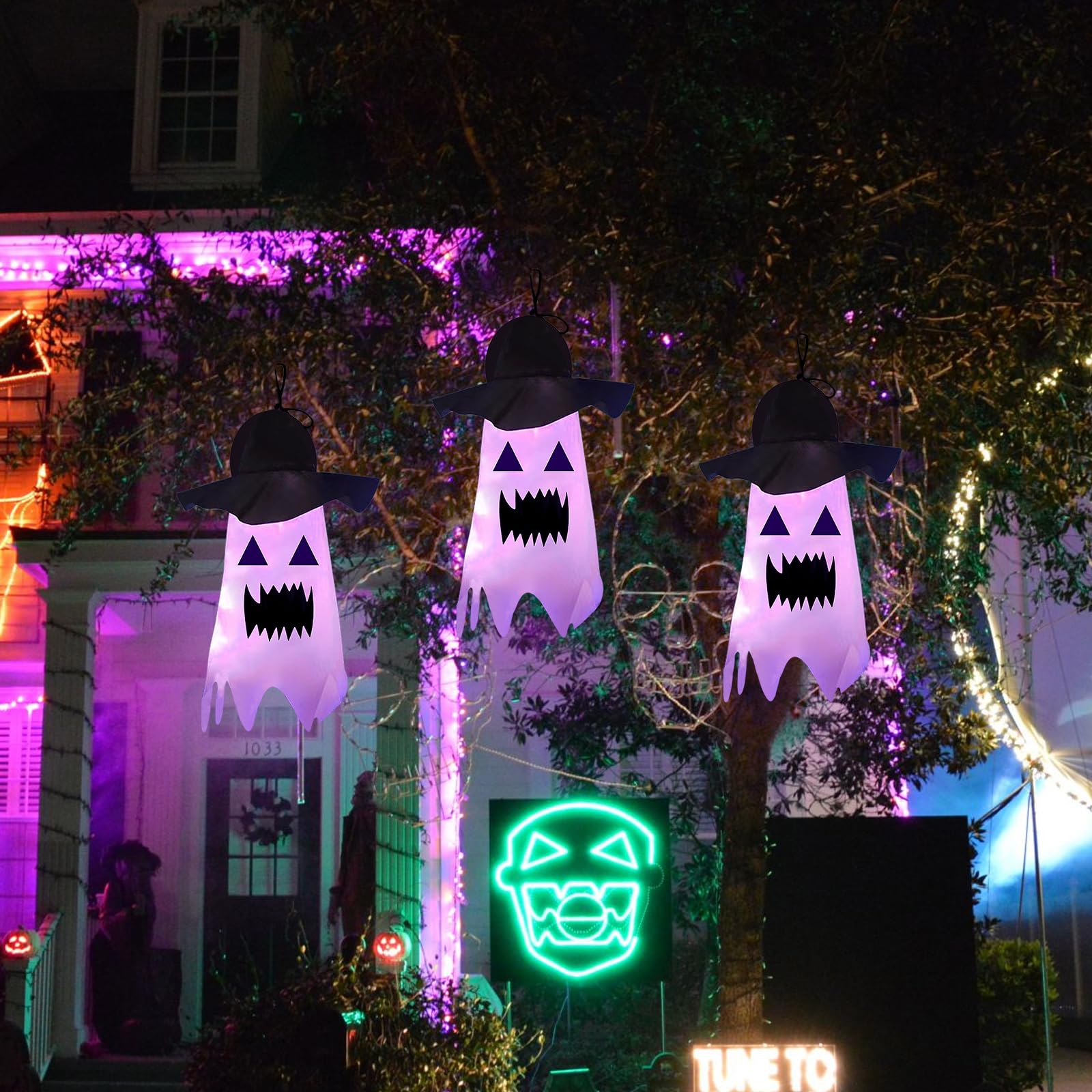 Einfach mit den mitgelieferten Haken oder Bändern aufhängen - schon schwebt der Geist gruselig im Wind. Das Design mit Hexenhut und Geistergesicht sorgt für Gänsehaut-Feeling bei allen Besuchern. Perfekt für Bäume, Zäune oder Hausfassaden.