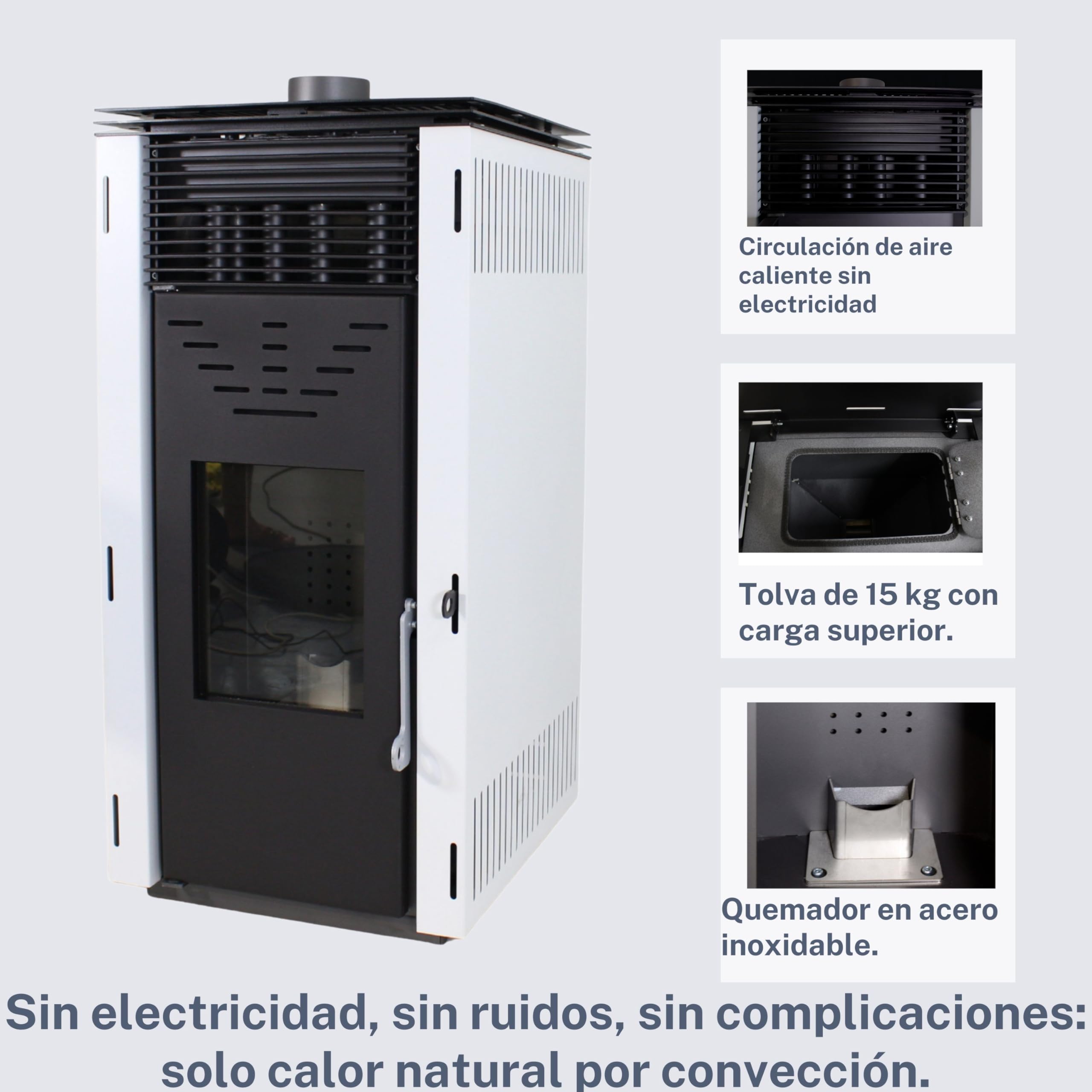 Boah, dieser Pelletofen braucht keinen Strom - total unabhängig! Mit 10kW Leistung heizt er Räume bis 200m³ komplett ohne Steckdose. Perfekt für Ferienhäuser oder bei Stromausfall. Der 15kg Trichter gibt dir lange Heizzeiten ohne ständiges Nachfüllen. Verbraucht nur 1,4-1,9kg Pellets pro Stunde - super sparsam! Maße: 97x51x47cm, passt auch in kleinere Räume. Luftsteuerung per Handhebel, keine komplizierte Elektronik. Einfache Installation und Reinigung. Mit Effizienzklasse A - umweltfreundlich und kostensparend. Über 30 Jahre Erfahrung von EIDER BIOMASA. Endlich warm, auch wenn mal der Strom ausfällt!