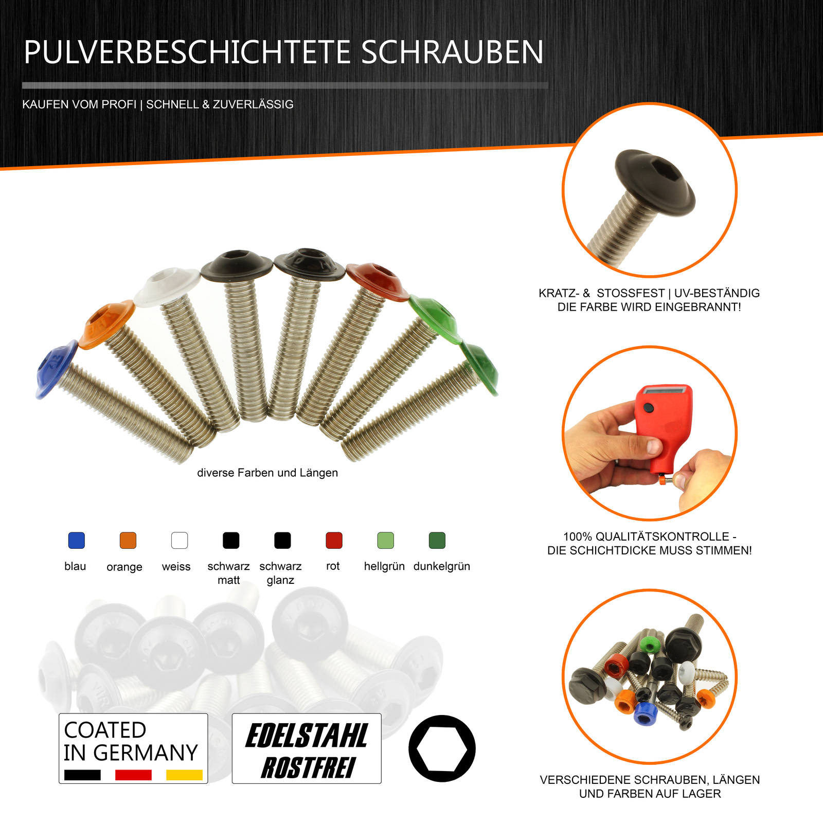 Profischrauben vom Feinsten! Diese 10 M6x12 Linsenkopfschrauben mit Flansch sind echte Allrounder. Aus rostfreiem V2A Edelstahl mit mattschwarzer Pulverbeschichtung - absolut kratz- und stoßfest! Die UV- und witterungsbeständige Beschichtung bleicht nicht aus - perfekt für draußen. Mit Torx-Antrieb (ISO7380-2) für sichere Montage ohne Abrutschen. Hergestellt in Deutschland - da stimmt einfach die Qualität! Ideal für Motorräder, Möbel, Fassaden und viele andere Projekte. Die Flansch-Unterlegscheibe ist integriert - spart Zeit beim Zusammenbau. Einfach mit handelsüblichem Torx-Werkzeug anziehen - sitzt bombenfest! Lieferung: 10x Schrauben im praktischen Beutel. Perfekt für anspruchsvolle Projekte wo's auf Qualität ankommt. Ob am Bike oder im Haus - mit diesen Schrauben machst du nichts falsch! Einfach bestellen und von deutscher Wertarbeit profitieren!