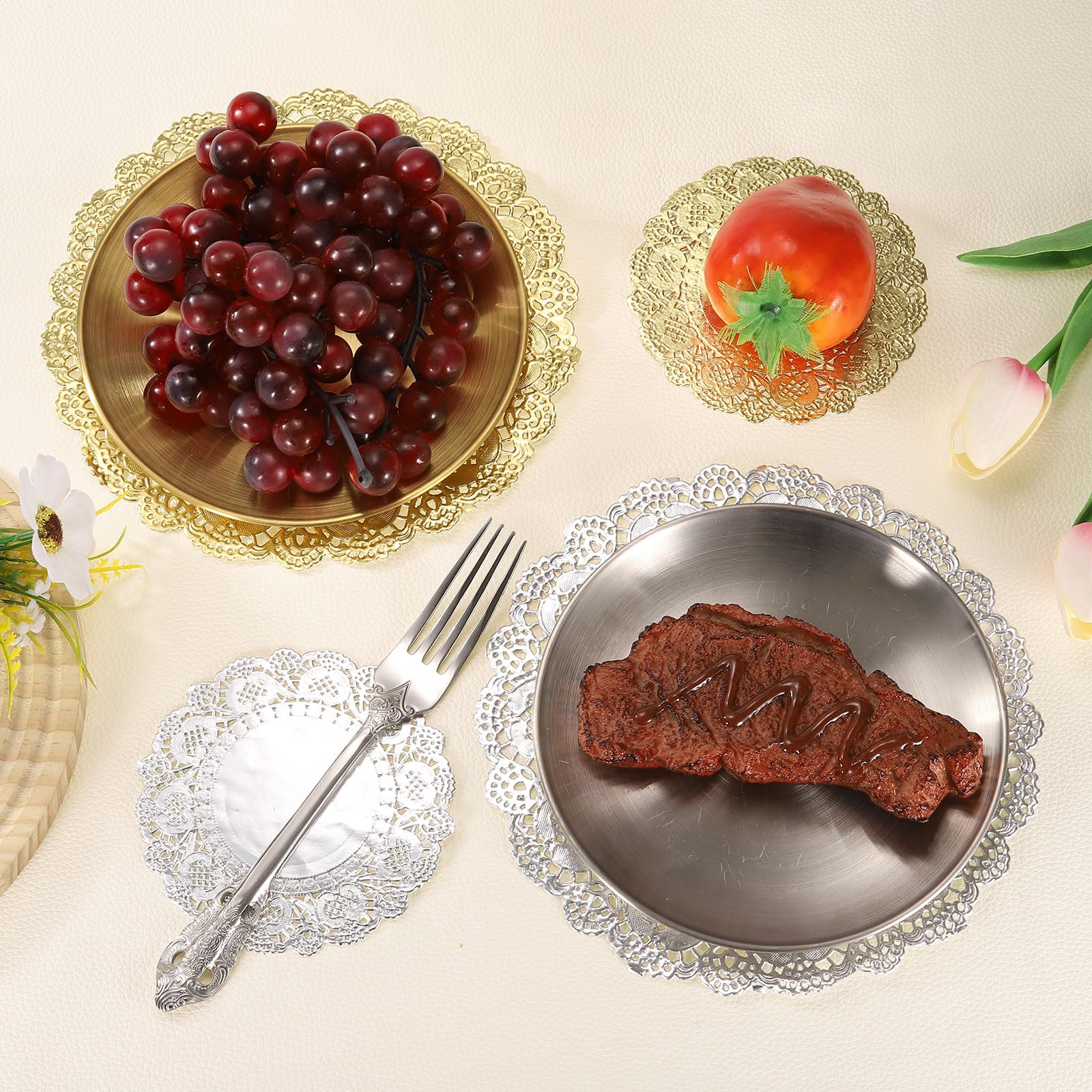 Mach deine Kuchenpräsentation zum Hingucker! Diese 100 goldenen Spitzenpapier-Unterlagen in 12,7cm Durchmesser sind perfekt für Torten, Desserts und Gebäck. Aus fettabsorbierendem Papiermaterial - schützt deine Teller und Tische vor klebrigen Rückständen. Das elegante Spitzenmuster verleiht jeder Tafel eine festliche Note. Super für Hochzeiten, Geburtstage, Weihnachten oder Teepartys - einfach auflegen und dekorieren! Nach Gebrauch entsorgen - kein Abwasch nötig. Spart Zeit und Nerven bei der Reinigung nach der Party. Aber Vorsicht: Nicht in die Nähe von offenen Flammen stellen und keine nassen/saftigen Speisen direkt darauf servieren. Im 100er-Set - genug für mehrere Feiern!