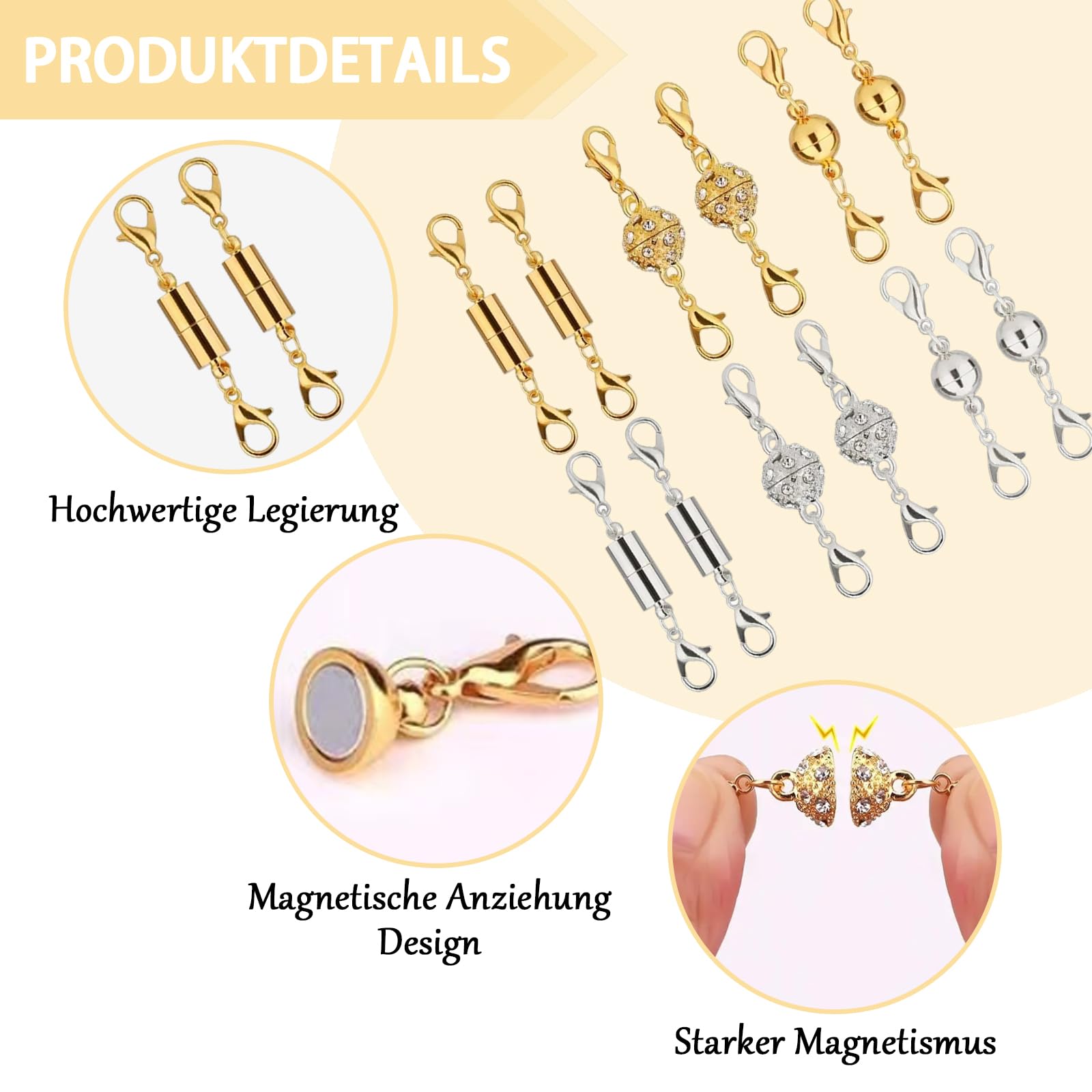 Bastelst du gerne eigenen Schmuck? Dann sind diese 12 magnetischen Verschlüsse genau das Richtige für dich! In Gold und Silber erhältlich, mit drei verschiedenen Designs: Strasskugel, zylindrisch und kugelförmig. Die starken Magnete halten deine Kreationen sicher zusammen, sind aber trotzdem super einfach zu öffnen und zu schließen. Perfekt für Armbänder und Halsketten - du kannst damit sogar die Länge anpassen! Die glänzenden Oberflächen sehen total edel aus und machen aus deinem DIY-Schmuck ein richtiges Accessoire. Ob für dich selbst oder als Geschenk - mit diesen Verschlüssen wird jeder Schmuck zum Hingucker. Einfach in der Handhabung und vielseitig einsetzbar für alle möglichen Schmuckstile. Ein Must-have für alle Schmuckliebhaber und Hobby-Bastler!