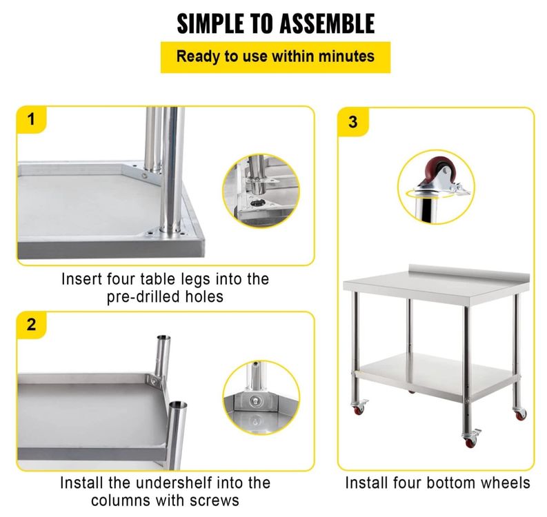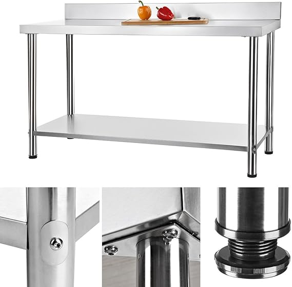 Rostfrei, stabil und super praktisch - dieser Edelstahl-Tisch ist ein Allrounder für Küche, Werkstatt oder Gastro! Maße: 120x60x85cm mit Rückwand und verstellbaren Füßen. Hält bis zu 250kg aus - da kannst du getrost schwere Sachen draufstellen. Aus hochwertigem Edelstahl 304 - einfach mit Wasser abspülen und sauber ist er. Mit extra großer Ablagefläche unten - perfekt für Zubehör und Utensilien. Einfache Montage - alles dabei für den schnellen Aufbau. Ob zum Kochen, Arbeiten oder Präsentieren - dieser Tisch macht überall eine gute Figur und hält ewig!
