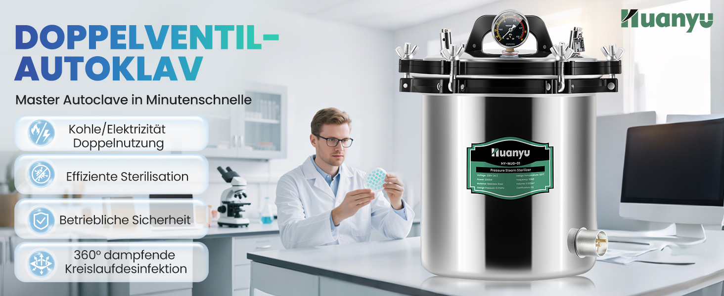 Professionelle Sterilisation für Labor und Forschung! Dieser 12-Liter Autoklav von Huanyu ist voll einstellbar - Temperatur (126-129°C) und Zeit (0-60 Minuten) kannst du genau nach Bedarf einstellen. Mit praktischem Schnellöffnungsmechanismus - kein Schrauben nötig, einfach drehen und der Deckel ist zu. Der Trockenlaufschutz sorgt für Sicherheit: Wenn zu wenig Wasser drin ist, schaltet er sich automatisch ab. Doppelte Ventilierung - Entlüftungsventil und Sicherheitsventil, das bei Überdruck selbstständig abbläst. Perfekt für Universitätslabore, Agrarforschung, Pilzanbau oder medizinische Instrumente. Nach dem Sterilisationsvorgang piept er - so weißt du genau, wann's fertig ist. Ein echter Profi-Helfer für keimfreie Arbeitsbedingungen!