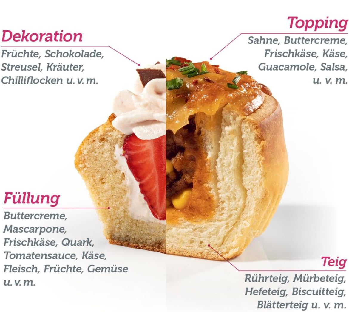 Bäckermeister aufgepasst! Diese 12 CUCAP Silikon-Ausstecher revolutionieren deine Muffin- und Cupcake-Kreationen. Statt mühsam nach dem Backen die Backwaren aufzuschneiden und auszuhöhlen (und dabei Teig zu verschwenden), backst du die perfekte Füllhöhle einfach mit! So geht's: Muffinform zu 2/3 mit Teig füllen, für ca. 5 Minuten bei 180°C vorbacken, dann den CUCAP in den Teig drücken und mitbacken. Nach dem Backen einfach herausziehen - und schon hast du die perfekte Aussparung für deine leckeren Füllungen! Ob süße Creme, Schokolade, Frischkäse oder herzhafte Füllungen wie Käse, Gemüse oder Fleisch - mit diesen Ausstechern wird jede Füllung zum Highlight. Die Silikon-Formen sind absolut vielseitig: Hitze-beständig für Backofen und Mikrowelle, spülmaschinenfest, geschmacksneutral und lebensmittelecht. Du kannst sie sogar in der Fritteuse oder im Gefrierschrank verwenden! Besonders praktisch: Ein Set enthält 12 Stück - genau passend für ein Standard-Muffinblech mit 6 Vertiefungen (du hast also immer Reserve). Die Zeiten von krümeligen Muffin-Resten und umständlichem Aushöhlen sind vorbei - mit CUCAP wird Backen zum puren Vergnügen! Deine Gäste werden staunen, was du für professionelle Ergebnisse hinbekommst!