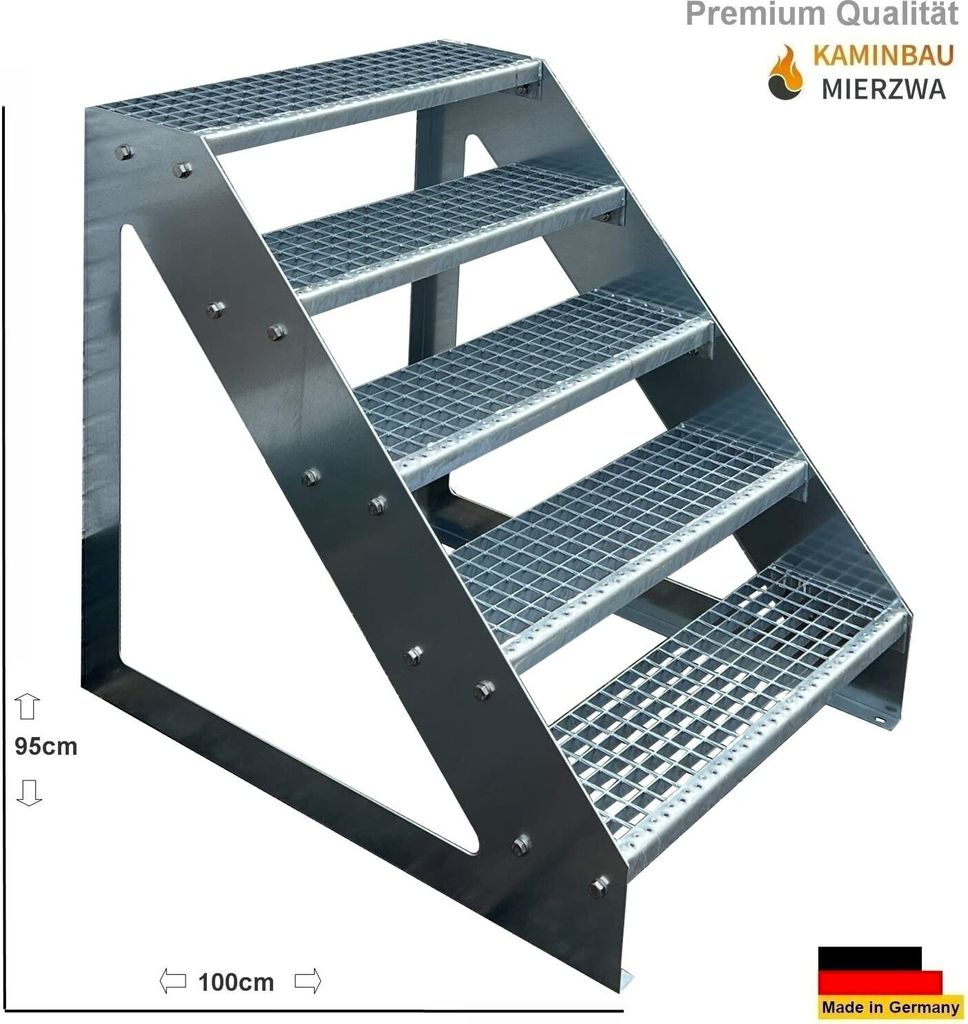 Brauchst du eine stabile und wetterfeste Treppe für deinen Garten oder deine Terrasse? Unsere Premium-Stahltreppe mit 13 Stufen ist genau das Richtige! Komplett feuerverzinkt nach DIN EN ISO 1461, rostet sie so schnell nicht - das garantiere ich dir! Mit einer Etagenhöhe von 247 cm und einer Treppentiefe von 253 cm passt sie perfekt zu den meisten Höhenunterschieden. Die Tritthöhe von 19 cm ist übrigens super bequem zum Begehen. Die Anti-Rutsch-Gitterroststufen mit 30x30 mm Maschenweite geben dir auch bei Nässe sicheren Halt. Du kannst zwischen verschiedenen Breiten wählen - 600, 800, 1000, 1200 oder 1400 mm. Die oberste Stufe ist bündig mit den Treppenwangen, sieht also nicht nur gut aus, sondern ist auch praktisch. Montage? Kein Problem! Alle nötigen Schrauben liegen bei, und du baust die Treppe fix zusammen. Nur die Wand- und Bodenbefestigung musst du je nach Untergrund selbst besorgen. Ob für den Garten, die Terrasse, Garage oder sogar für den Camper - diese Treppe macht überall eine gute Figur! Und das Beste: Made in Germany mit 3 Jahren Herstellergarantie!