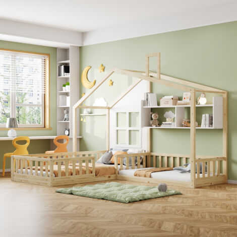 Dieses niedliche Kinderbett in Hausform macht jedes Kinderzimmer zum Lieblingsort! Aus massivem Kiefernholz gebaut, ist es robust und hält auch wilden Spielaktionen stand. Mit 140x200 cm bietet es viel Platz zum Träumen und Toben. Das coole Extra: Integrierte Regale und Stauraum für Bücher, Spielsachen und Schnickschnack. Sogar eine Kreidetafel ist dabei - da können die Kleinen malen und schreiben, wie sie wollen! Das Sicherheitsgitter und die Tür sorgen dafür, dass dein Kind sicher schläft. Inklusive Lattenrost, der bis zu 150 kg hält. Montage nötig, aber mit Anleitung machbar. Ein Bett, das mitwächst und jede Menge Spaß bringt!