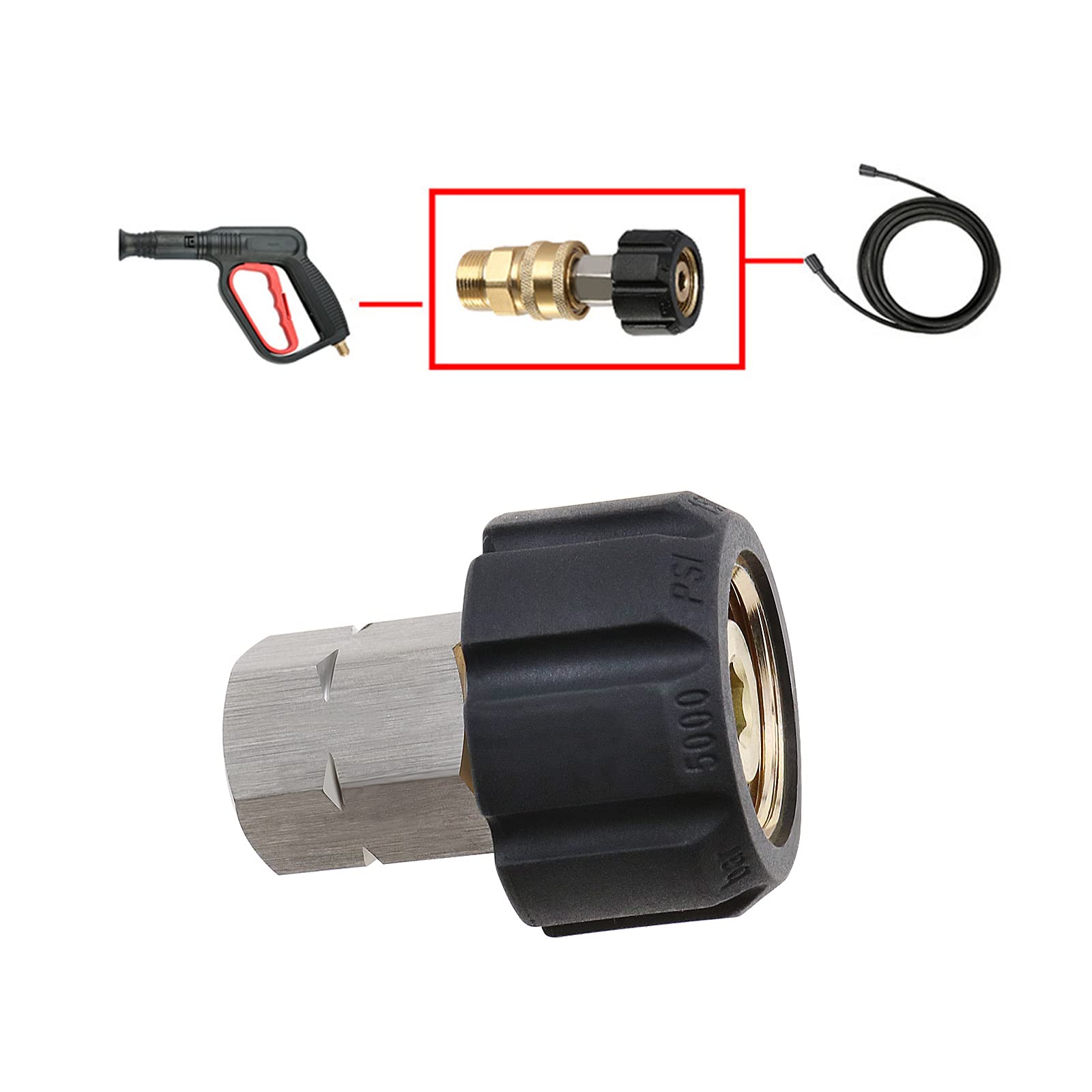 Moin Hochdruck-Reinigungsexperte! Genervt vom lästigen Schlauchwechsel an deinem Hochdruckreiniger? Dieser Schnellanschluss-Adapter macht alles viel einfacher! \\n\\nWas du bekommst: \\n• 1x Verbindungsadapter \\n• 1x Hochdruckreiniger-Adapter \\n• Material: Messing und Aluminium \\n• Anschluss: M22 mit 14 mm Innendurchmesser \\n• Kompatibel mit Kärcher K2, K3, K4, K5, K6, K7 \\n\\nWarum dieser Adapter dein Leben leichter macht: \\n• Schnellverschluss-System - Schläuche wechseln in Sekunden \\n• Bis zu 220 bar Druck halten - absolut sicher \\n• Robuste Messing-Konstruktion - hält ewig \\n• Einfache Montage - kein Werkzeug nötig \\n• Perfekt für Schlauchverlängerungen \\n\\nEgal ob du deinen Kärcher fürs Auto, die Terrasse oder die Fassade verwendest - mit diesem Adapter wechselst du die Schläuche ratzfatz. Das M22-Gewinde passt perfekt und sitzt bombenfest. \\n\\nDas Beste: Du kannst jetzt ganz easy deine Schlauchlänge verlängern und kommst damit auch an die wirklich schwer erreichbaren Stellen. Mehr Flexibilität, mehr Reichweite, mehr Sauberkeit! \\n\\nDie Verarbeitung ist absolut professionell - Messing und Aluminium sind korrosionsbeständig und machen auch nach Jahren noch eine gute Figur. \\n\\nWichtig: Immer vor Gebrauch prüfen, ob die Verbindung wirklich fest sitzt. Sicherheit geht vor! \\n\\nHol dir diesen praktischen Adapter und mach deine Reinigungsarbeiten effizienter und angenehmer!