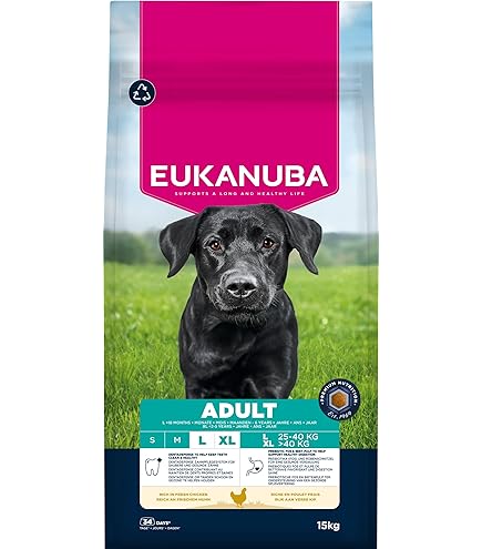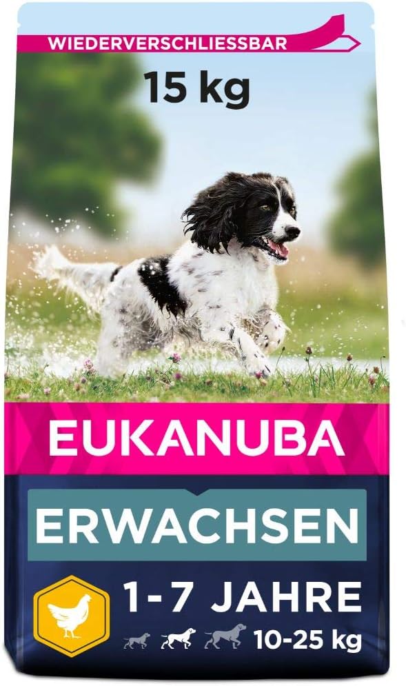 Premium-Futter für deinen mittelgroßen Hund! Eukanuba mit frischem Huhn ist speziell für Rassen von 10-25kg im Alter von 1-7 Jahren entwickelt. Ohne künstliche Aromen, Farbstoffe oder GVO - nur das Beste für deinen Liebling.\\n\\nDie Rezeptur mit L-Carnitin unterstützt den Fettstoffwechsel und hilft, das Idealgewicht zu halten. Präbiotika und Rübenschnitzel fördern eine gesunde Verdauung. Der DentaDefense Komplex sorgt für saubere Zähne.\\n\\nHergestellt in den Niederlanden mit 120 Qualitätskontrollen. Hochwertige tierische Proteine für kräftige Muskeln, Omega-6 und Omega-3 für glänzendes Fell. 15kg Vorratspackung - dein Hund wird's lieben!
