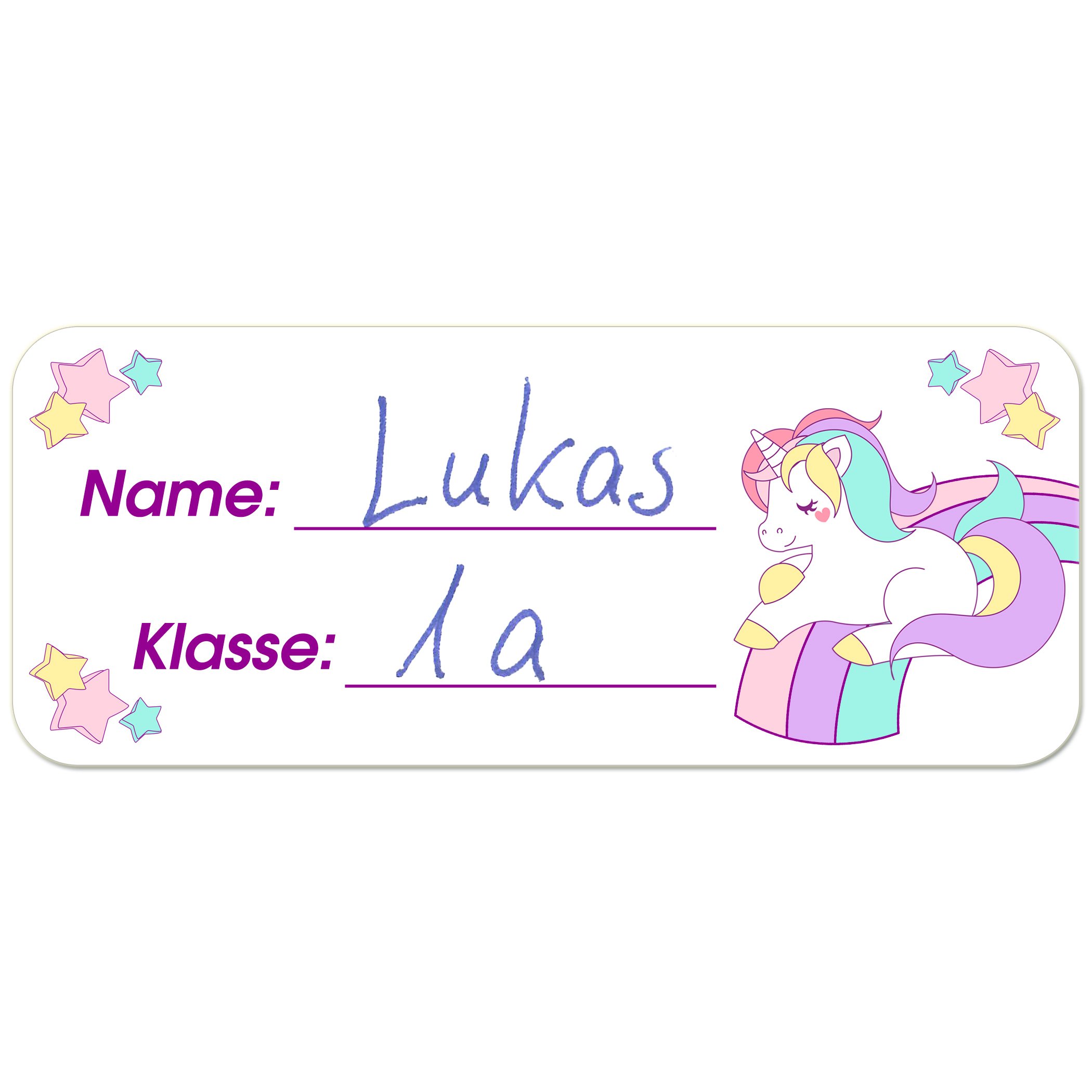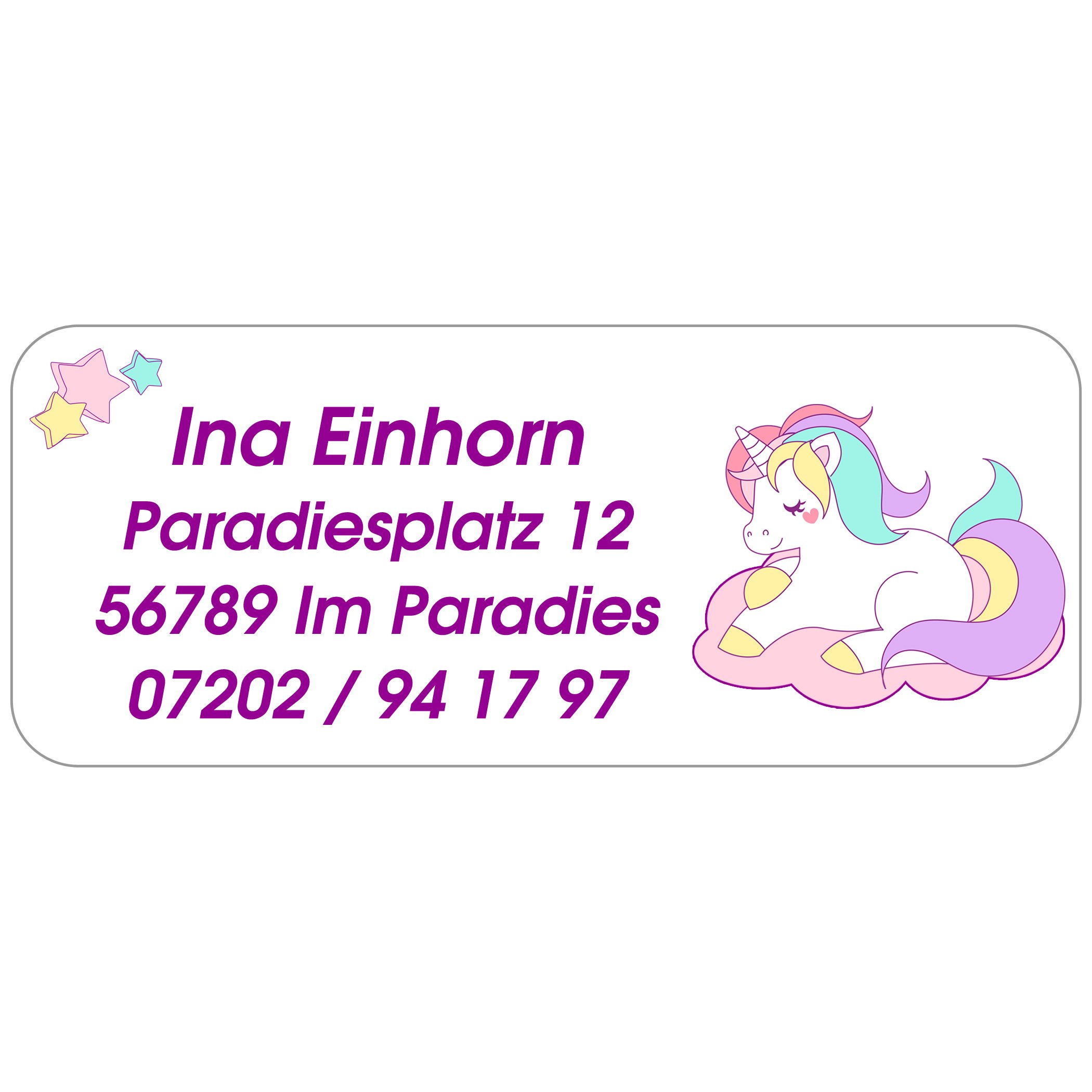 Wow - 160 süße Einhorn-Aufkleber für dein Kind! Perfekt für Schulhefte, Bücher, Brotdosen oder als Absenderetiketten. Jeder Aufkleber wird mit deinem persönlichen Wunschtext bedruckt - ob Name, Adresse, Telefonnummer oder ein lustiger Spruch. Du hast Platz für 1-5 Zeilen mit je 30 Zeichen.