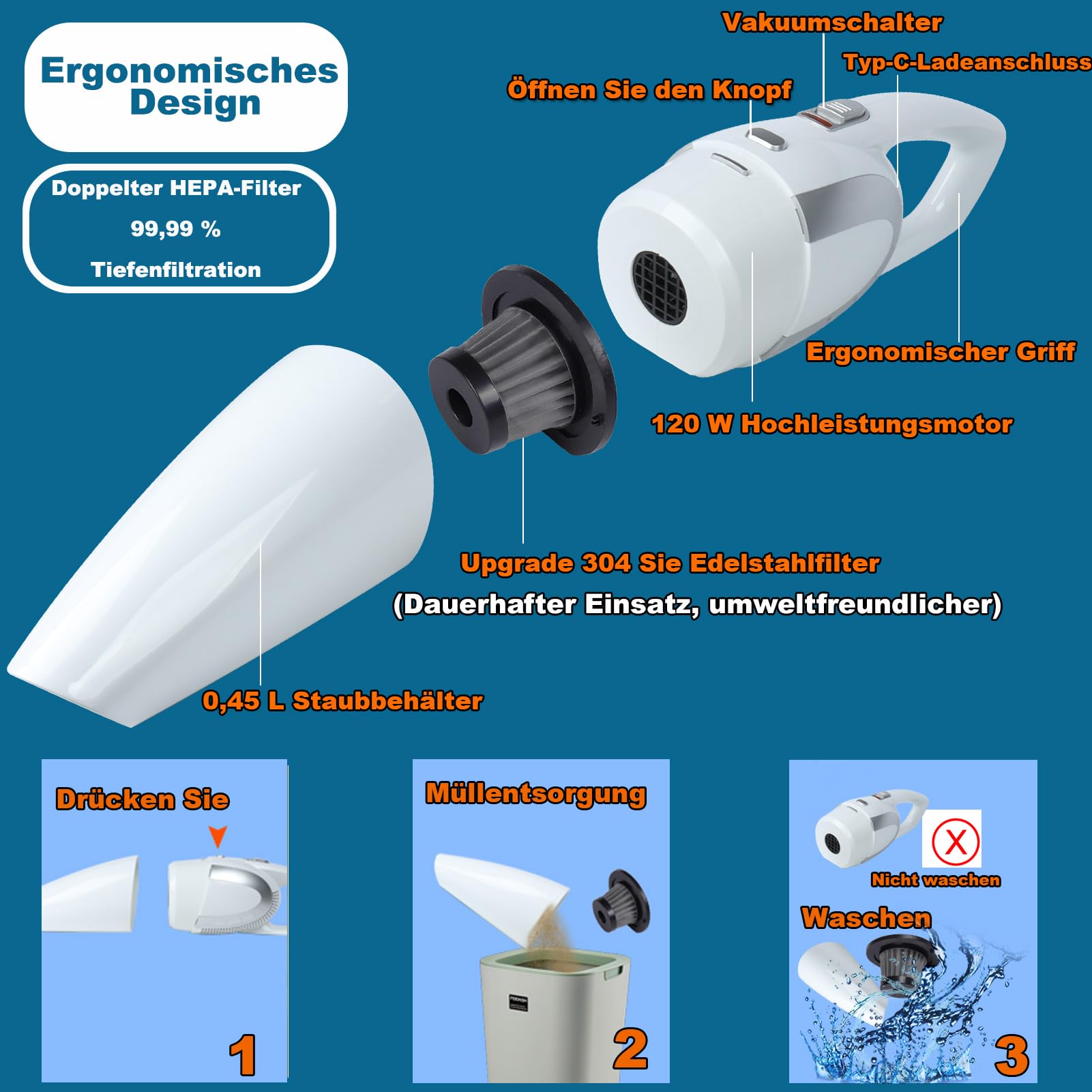 Der SRAYG Handstaubsauger mit 16000Pa Saugkraft ist dein neuer Reinigungs-Profi! Mit 120W bürstenlosem Motor saugt er Staub, Krümel und sogar Flüssigkeiten problemlos weg. Der große 7500 mAh Akku gibt dir bis zu 30 Minuten Power - perfekt für Auto, Sofa oder Treppen. Mit nur 1 kg Gewicht ist er super handlich und der ergonomische Griff liegt perfekt in der Hand. Der Metall-Filter ist waschbar und hält 99,99% des Feinstaubs zurück. Besonders leise mit nur 60dB - ideal für Familien mit Kindern oder Haustieren. Das 6-in-1 Zubehör macht jede Reinigung zur Leichtigkeit. IP65 Schutz gegen Spritzwasser - auch für nasse Überraschungen gerüstet. Dein Allrounder für blitzsaubere Ergebnisse!