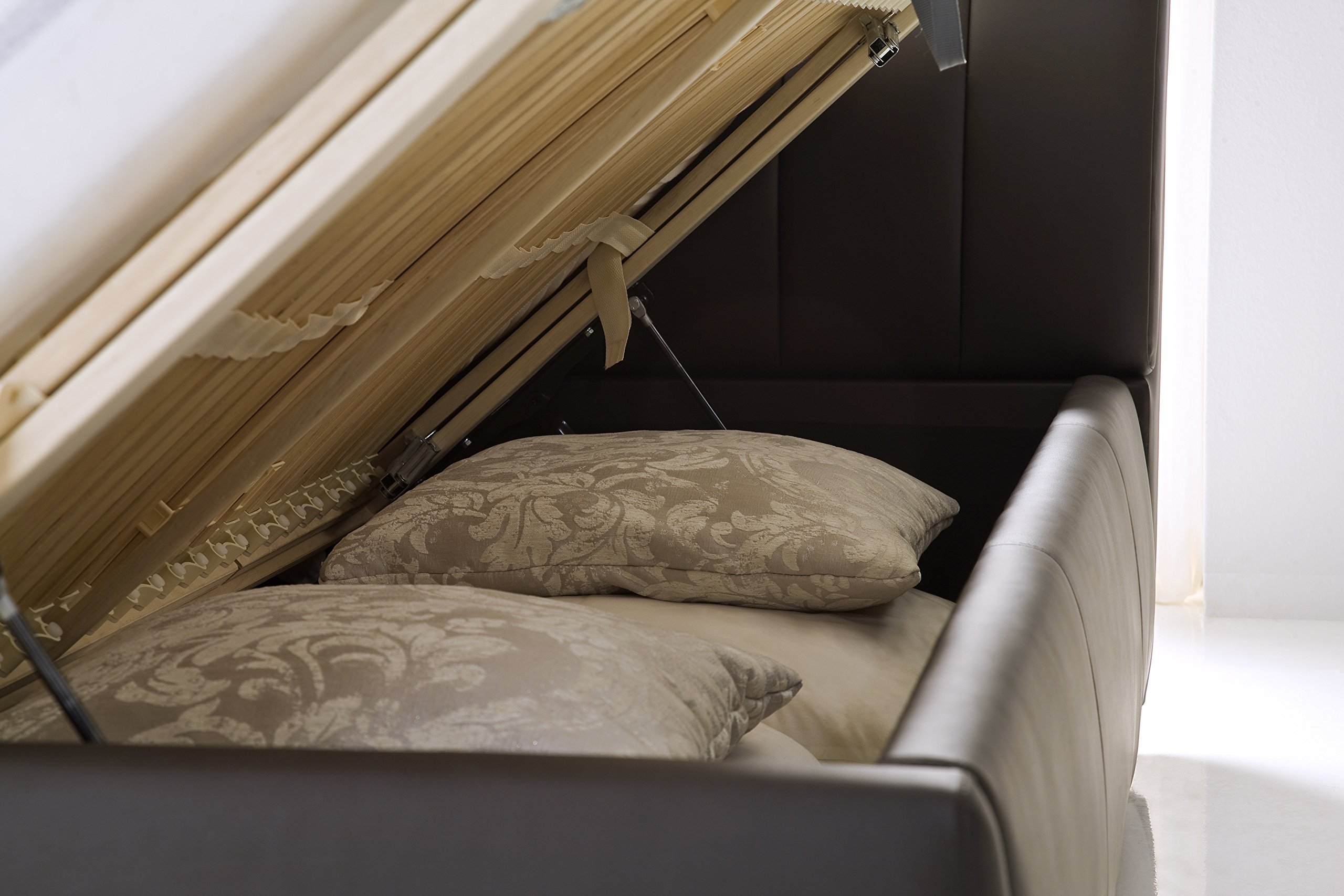 Das Kunstleder ist nicht nur super schick, sondern auch praktisch: Schmutzabweisend und mit nem feuchten Tuch easy zu reinigen. Die Sperrholzlatten sorgen dafür, dass deine Matratze immer an Ort und Stelle bleibt - egal wie viel du dich nachts drehst. Das Kopfteil gibt dir perfekte Unterstützung wenn du mal entspannt sitzen willst. Übrigens: Das Bett kommt komplett zerlegt mit Montageanleitung. Matratze musst du separat besorgen - aber dafür haben wir auch was im Shop! Ein Bett, das wirklich was her macht und dazu noch mega bequem ist.
