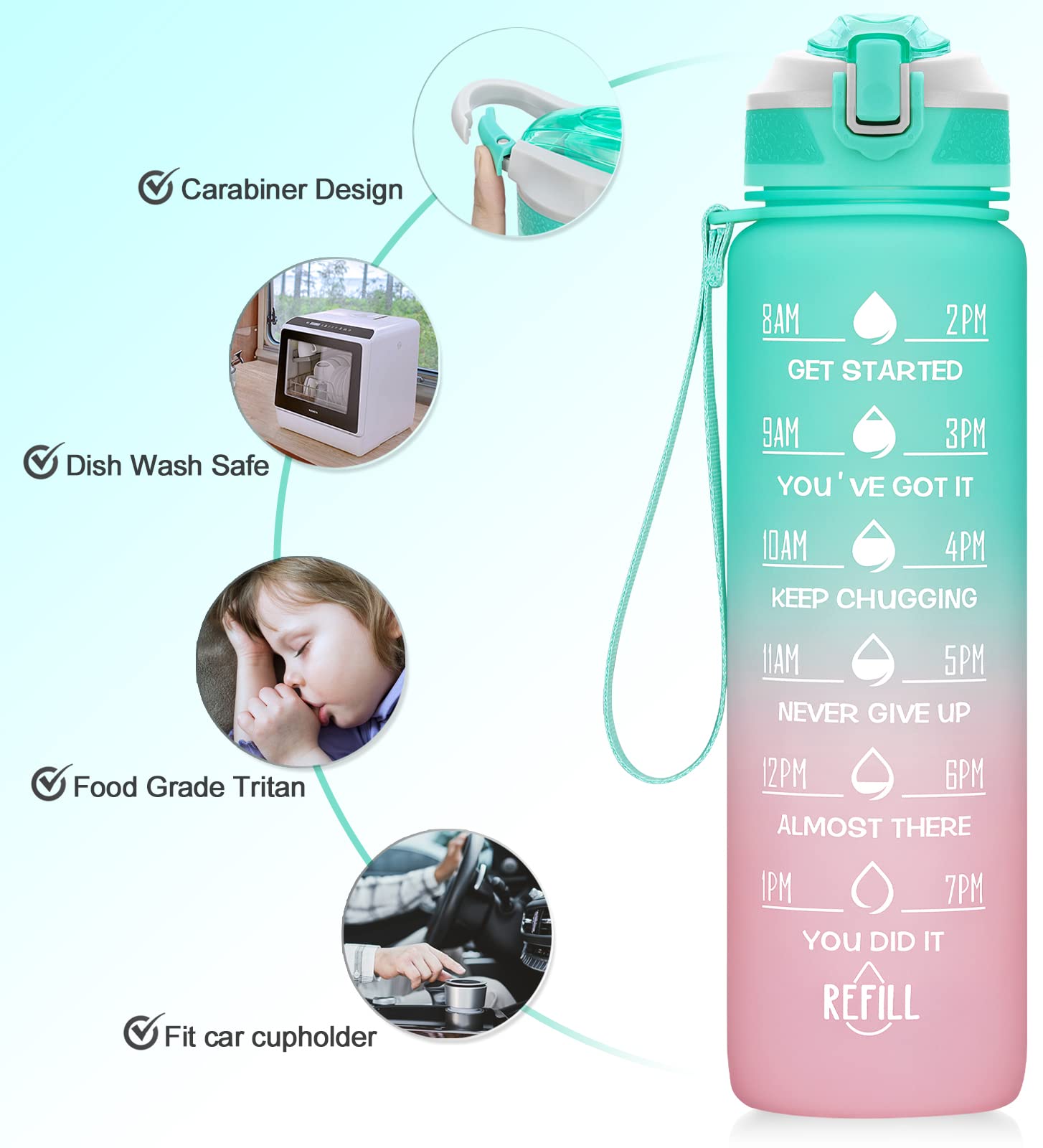 Dein perfekter Begleiter für mehr Wasserkonsum! Diese MEITAGIE Trinkflasche aus BPA-freiem Tritan fasst 1 Liter und motiviert mit praktischer Zeitmarkierung. Mit Fruchtfilter für erfrischende Infused Water - einfach Früchte, Eis oder Teebeutel hinzufügen. Innovativer 1-CLICK Verschluss für einfaches Einhand-Bedienen. Vollständig auslaufsicher durch Silikondichtung und Sicherheitsschloss. Kohlensäuregeeignet und spülmaschinenfest (Dichtung vorher entfernen). Breite Öffnung (6cm) für einfaches Reinigen und Befüllen. Mit tragbarer Handschlaufe - ideal für Sport, Schule, Büro oder unterwegs. Schone die Umwelt und spare Geld gegenüber Einwegflaschen!