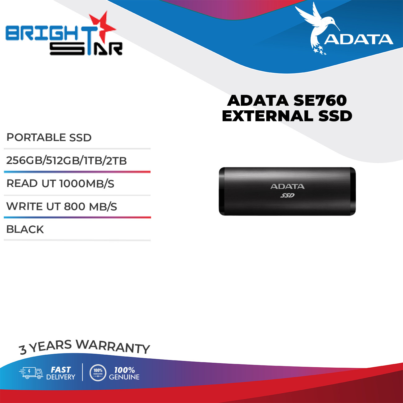 ADATA SE760 1TB Portable SSD - USB-C 3.2 Gen 2, Bis 1000 MB/s, Schwarz