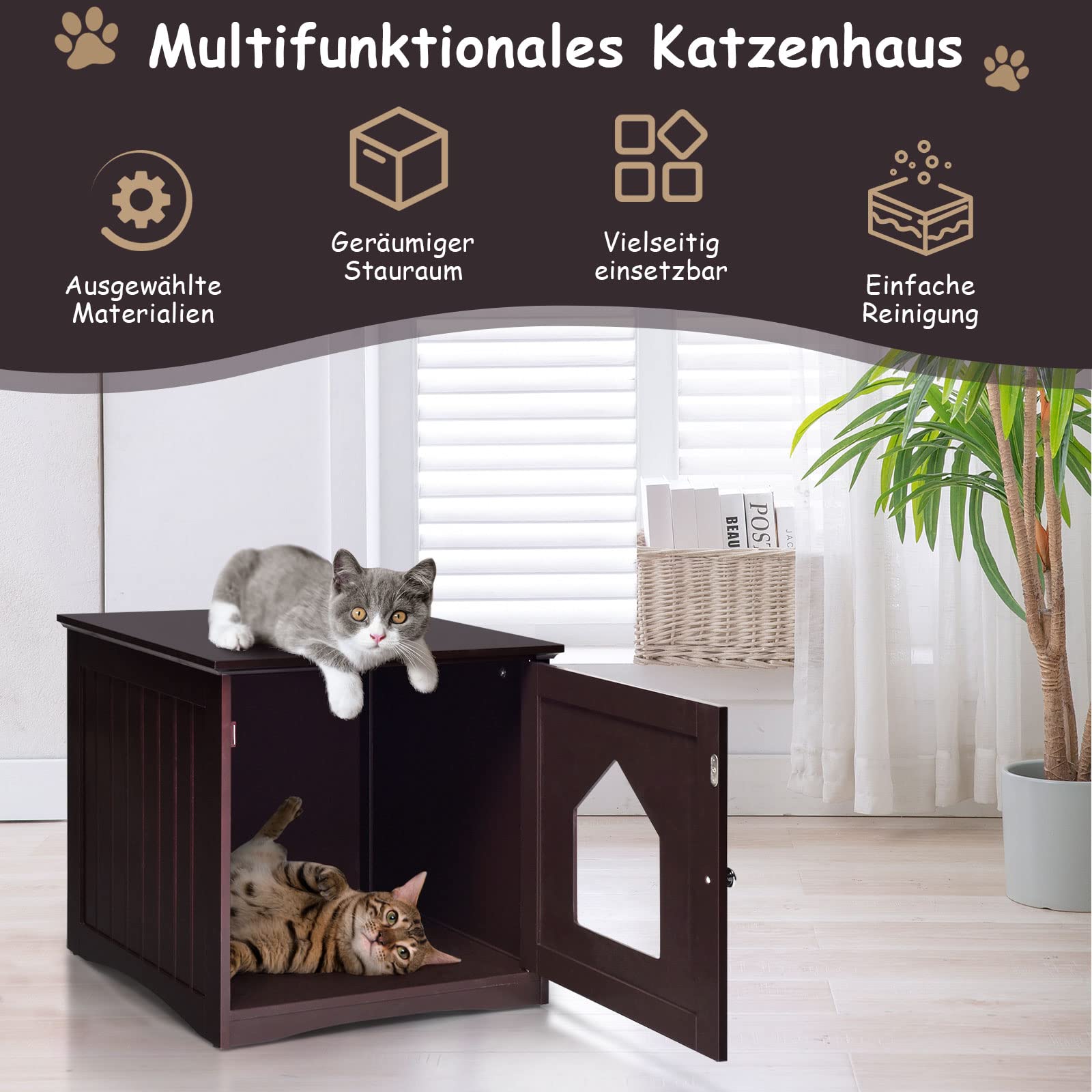 Deine Katzen werden verrückt nach diesem Katzenhaus sein! Zwei Etagen auf 38x68x66cm - da ist genug Platz für 1-2 Stubentiger. Aus robustem MDF in schicker Braun-Weiß-Optik - passt in jede Wohnung. Das Beste: Aufbau komplett ohne Werkzeug! Einfach zusammenstecken und in 15 Minuten steht die Villa. Oben können die Katzen Ausschau halten, unten ist es gemütlich zum Schlafen. Durch die Laser-Schneiderei kanns kurz nach Brand riechen, aber das verfliegt schnell. Nur für innen geeignet - aber da sind Katzen ja eh am liebsten. Einfach aufstellen und zusehen, wie deine Katzen ihr neues Reich erobern!