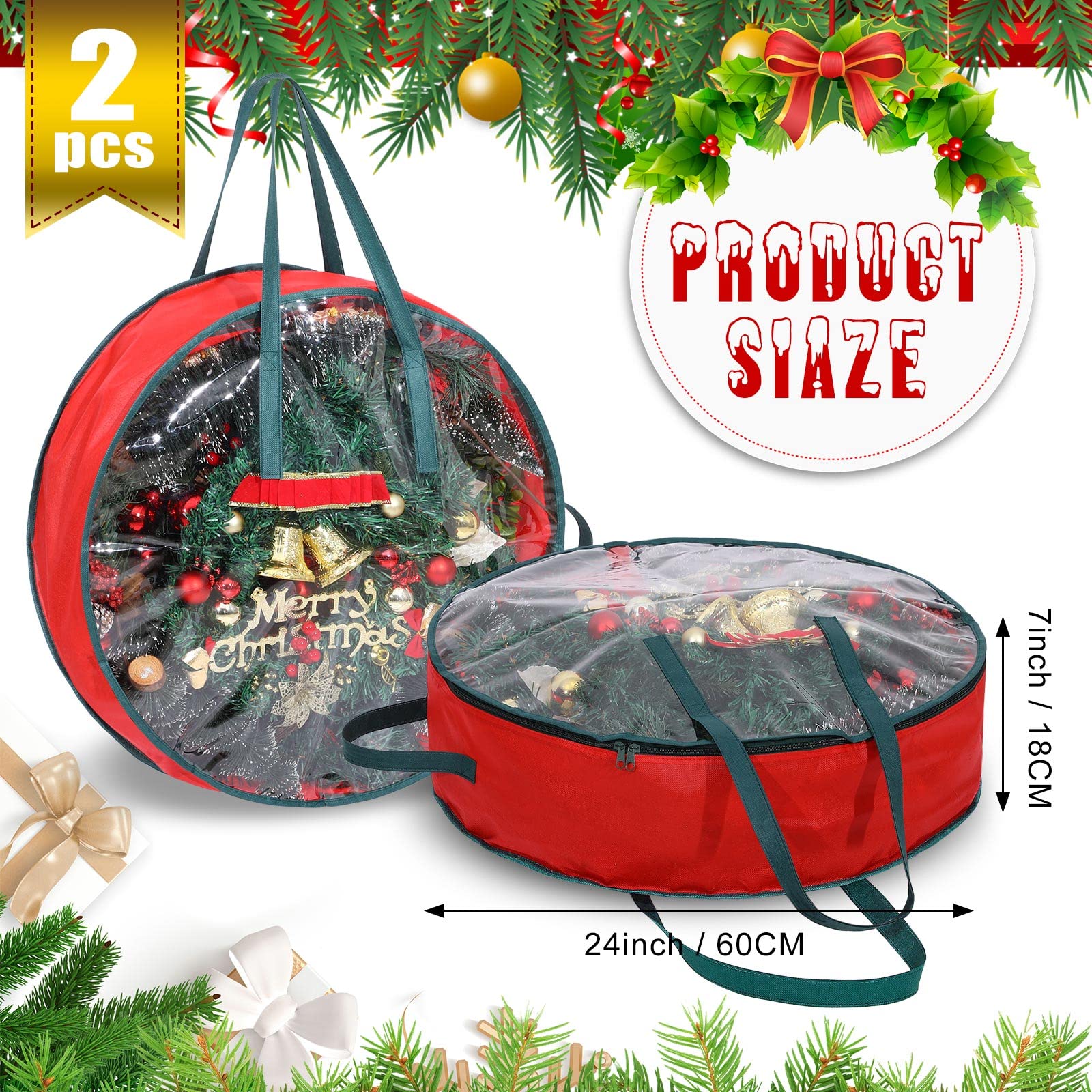 2 Stück Transparente Weihnachtskranz-Aufbewahrungstaschen 61cm - Doppelreißverschluss & Wasserdicht