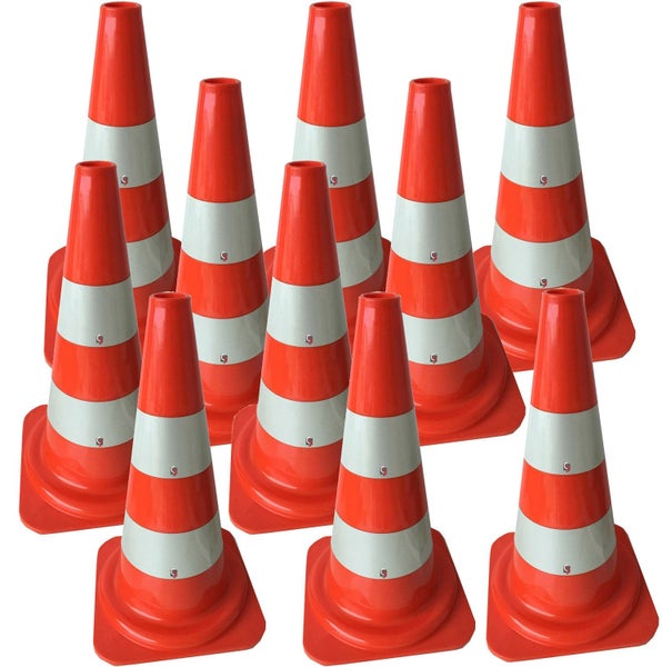 Pass auf - mit diesen Leitkegeln wirst du gut gesehen! 2 Stück im Set, je 50cm hoch in knalligem Gelb mit reflektierenden roten Streifen (Klasse RA1). Die Dinger sind mega praktisch: frostbeständig bis -20°C, aus weichem PVC und super stapelbar. Der Standfuß ist aus 100% Recyclingmaterial und gibt bombenfesten Halt. Mit ca. 900g pro Kegel sind sie schwer genug um nicht umzufallen, aber trotzdem leicht zu transportieren. Perfekt für Baustellen, Veranstaltungen, Parkplatzmarkierungen oder als Absperrung. Die reflektierenden Streifen machen sie auch bei Dunkelheit super sichtbar. Einfach aufstellen und du bist auf der sicheren Seite - ob auf der Arbeit oder beim privaten Einsatz!
