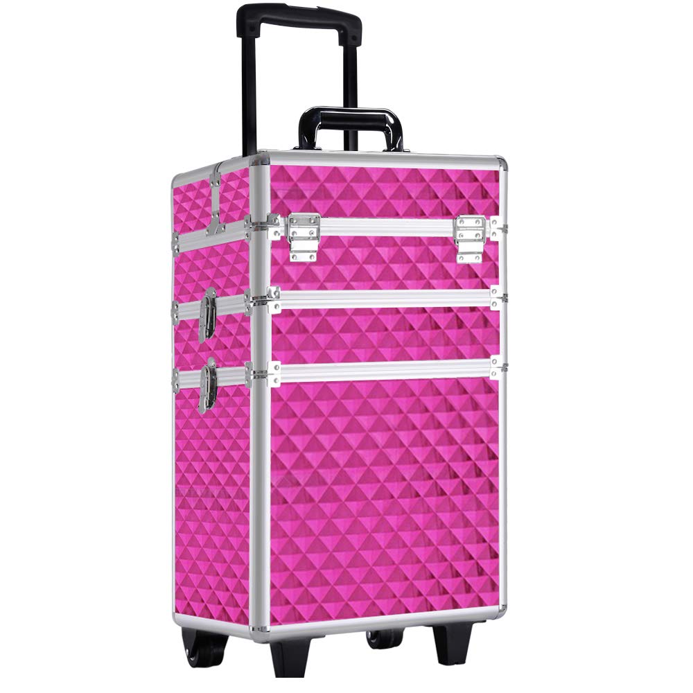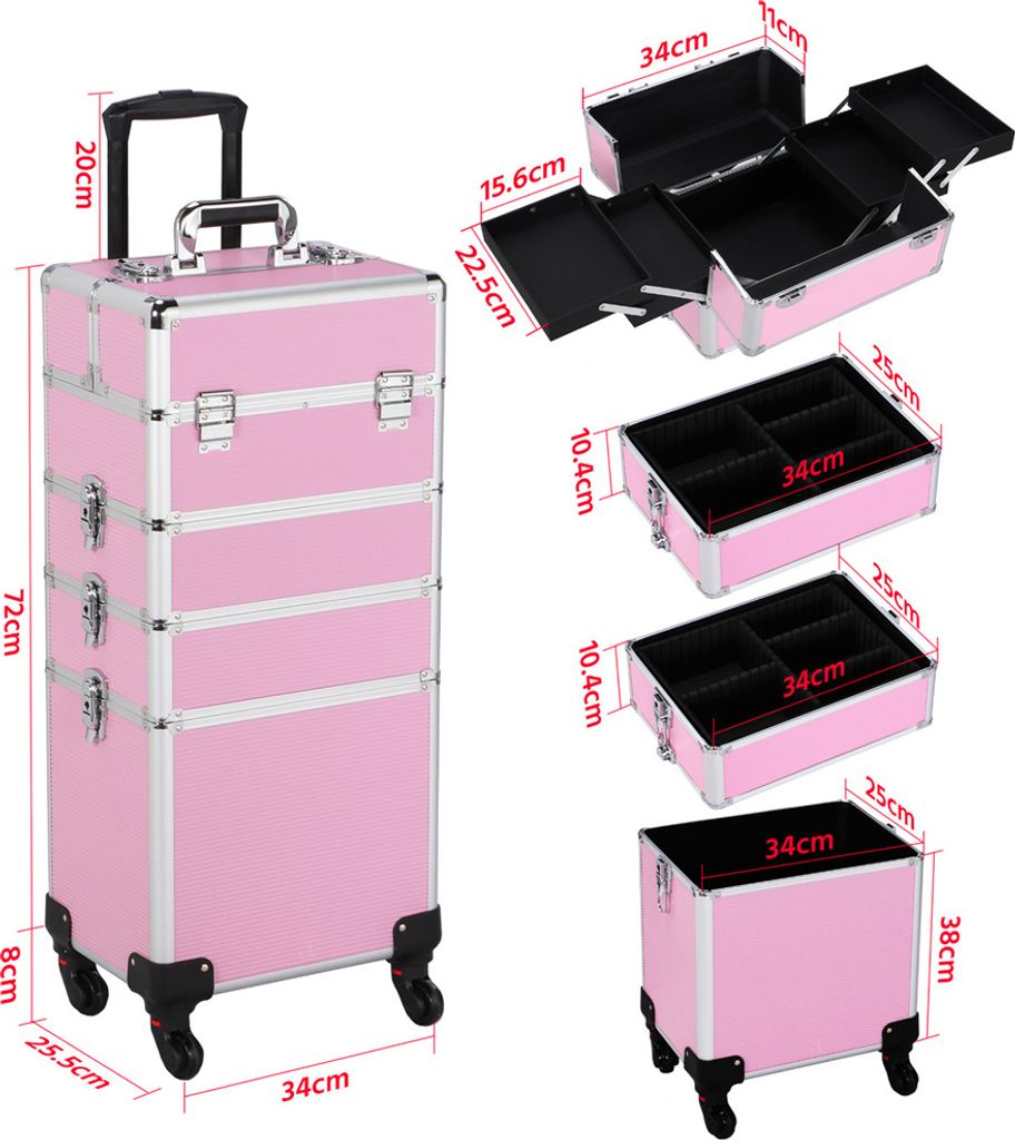 Wow, dieser 2-in-1 Kosmetikkoffer ist ja der absolute Profi! Aus Aluminium und ABS, rosa und modern - einfach stylisch. Wird zum rollbaren Tisch mit 57x38x68 cm Arbeitsfläche. 4 Schubladen mit unterschiedlichen Höhen (15cm, 9,5cm, 7cm, 7cm) für all dein Beauty-Zubehör. Trägt bis zu 50kg - stabil und sicher. Mit 4 Rädern mit Bremsen - überall mobil einsetzbar. Doppelverriegelung mit Sicherheitsschlössern - deine Utensilien sind sicher verwahrt. Perfekt für Friseure, Visagisten oder mobile Beauty-Services. Einfach ausklappen und schon ist deine professionelle Make-up-Station fertig! Alles dabei, was du für unterwegs brauchst.