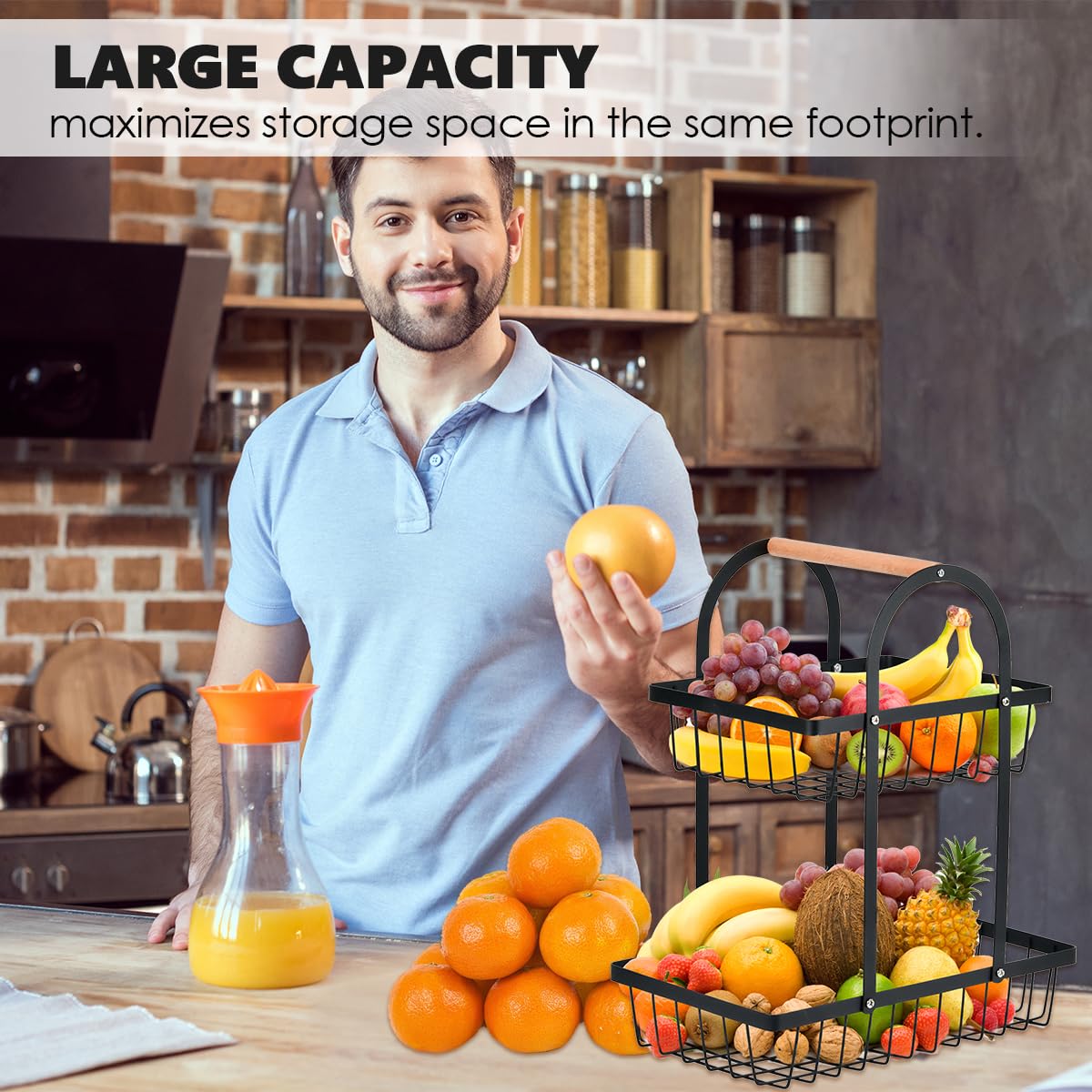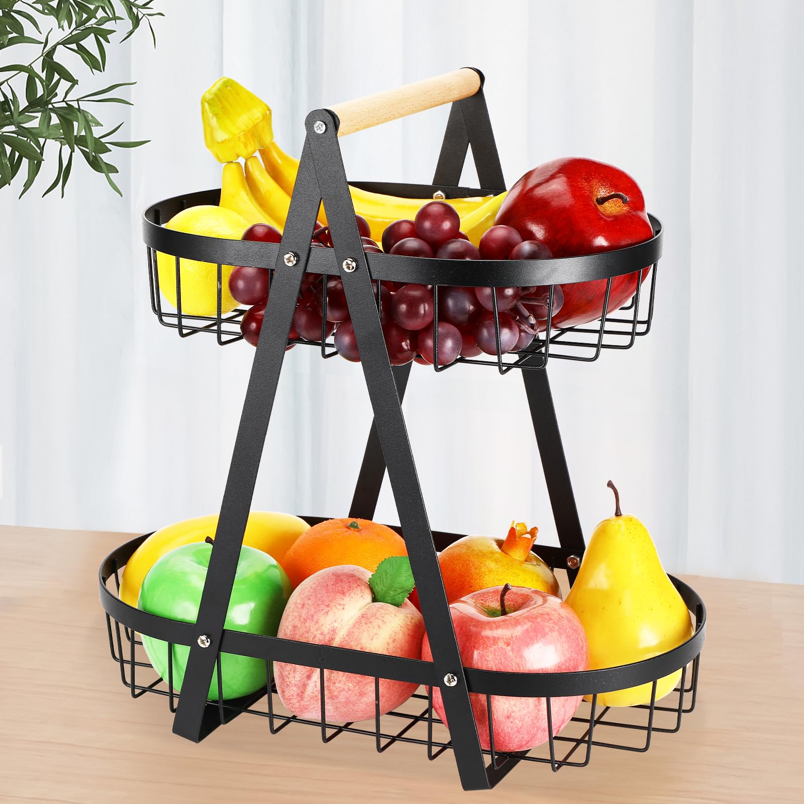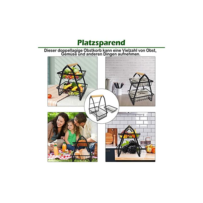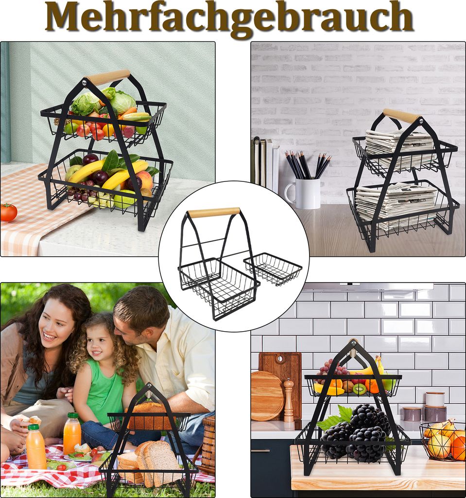 Endlich Ordnung in der Küche! Dieser 2-stöckige Obstkorb ist die perfekte Lösung für alle, die Platz sparen und trotzdem alles griffbereit haben wollen. Mit den Maßen 27×17×29cm findet er auch in kleinen Küchen problemlos Platz.\n\nDer obere Korb (21×17cm) ist ideal für kleinere Früchte wie Äpfel, Orangen oder Kiwis, während der untere Korb (27×17cm) perfekt für größeres Obst wie Melonen, Ananas oder Brotlaibe ist. So hast du alles schön getrennt und übersichtlich.\n\nHergestellt aus robustem Metall mit schicker Pulverbeschichtung ist dieser Obstkorb nicht nur stabil, sondern auch richtig schön anzusehen. Die praktischen Holzgriffe machen das Tragen zum Kinderspiel.\n\nDas durchlässige Design sorgt für optimale Luftzirkulation - dein Obst und Gemüse bleibt länger frisch! Keine matschigen Stellen mehr durch Staunässe.\n\nSuper praktisch: Die Ebenen sind abnehmbar! Du kannst sie als zwei einzelne Körbe nutzen oder gestapelt - je nach Bedarf. So bist du maximal flexibel.\n\nNicht nur für die Küche geeignet! Perfekt auch fürs Büro, Bad oder Wohnzimmer. Ob für Obst, Gemüse, Snacks, Handtücher oder Bürobedarf - dieser vielseitige Korb organisiert deinen Raum optimal. Ein echter Hingucker, der gleichzeitig mega praktisch ist!