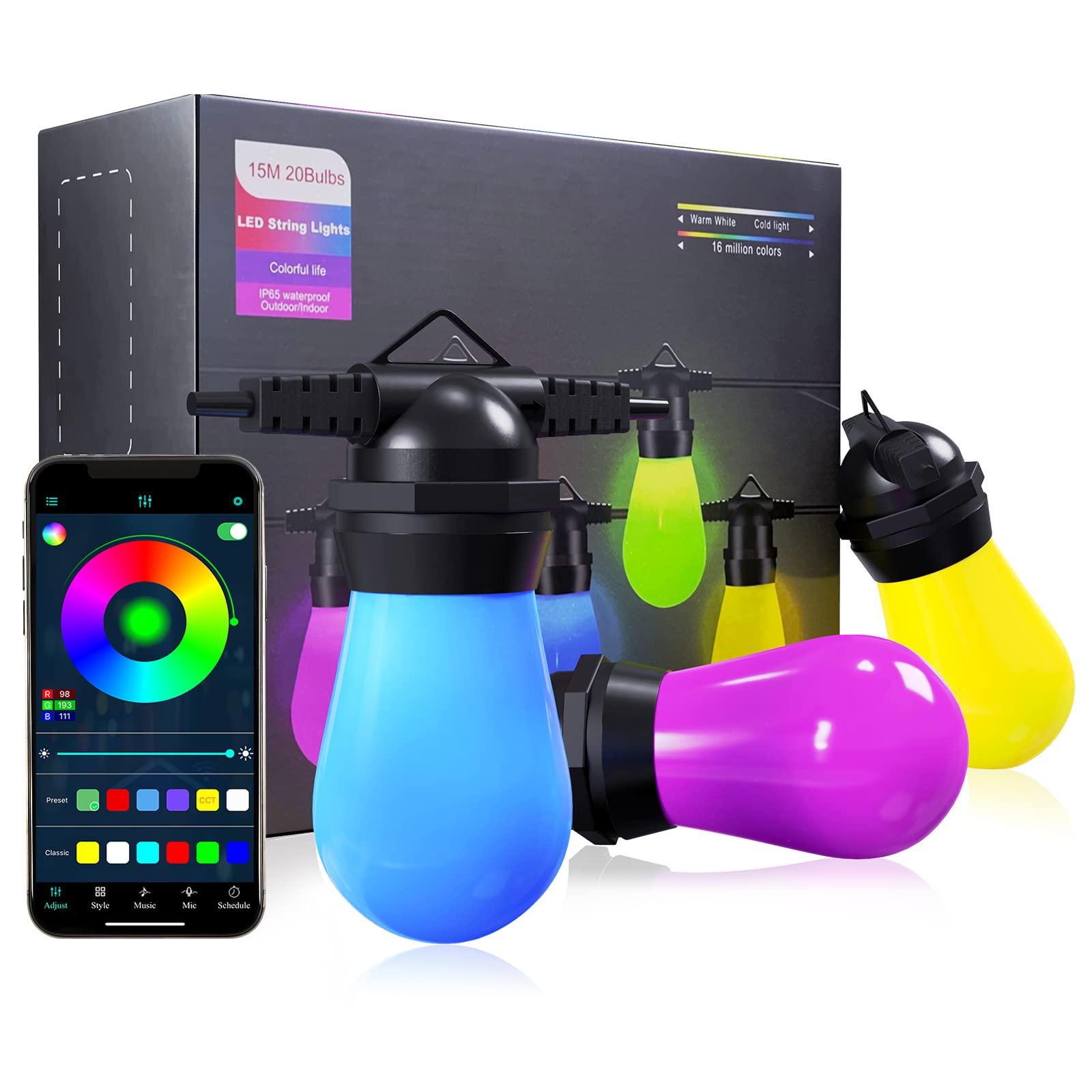 Ciskotu 15m RGB LED Lichterkette - 20 S14 Birnen Mit App Steuerung IP65