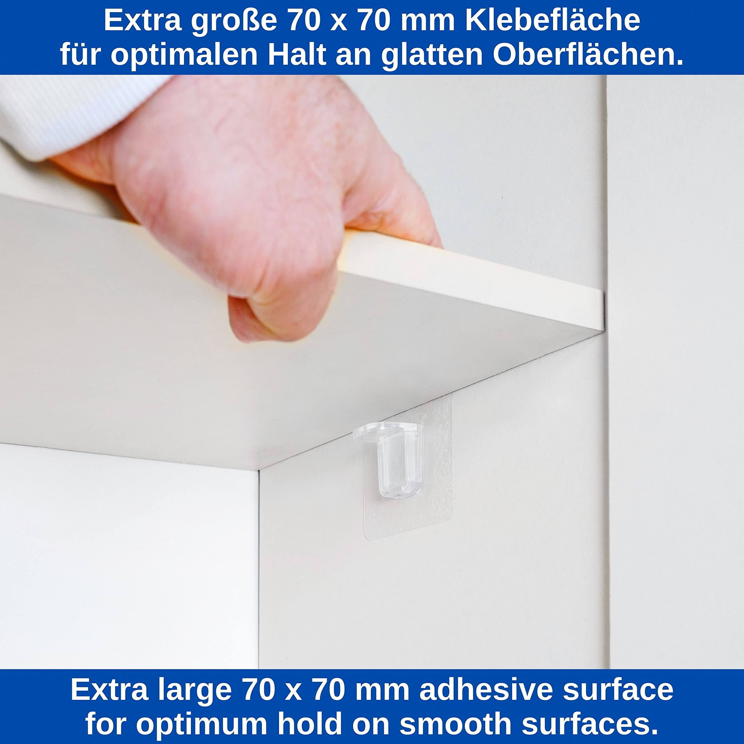 Regale fixieren war noch nie so einfach! Diese 20 transparenten Klebewinkel haften superfest ohne Bohren. Einfach Schutzfolie abziehen und auf glatte Oberflächen drücken - schon hält dein Regal bombenfest. Jeder Winkel trägt bis zu 10kg, also insgesamt richtig viel Gewicht. Unsichtbar und praktisch für Schränke, Regale, Küche, Bad... Überall wo was rutscht oder wackelt. Spart Zeit und Nerven - und deine Wände bleiben heil. Einfach genial!