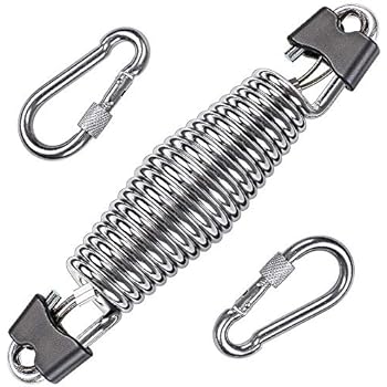Geniale Schwingfeder von Vegena für deinen Hängesessel! Hält bis zu 200 kg und ist aus robustem 304 Edelstahl - rost- und korrosionsgeschützt für innen und außen. Die Feder ist 15 cm lang mit 35 mm Durchmesser und ermöglicht sanftes Schwingen, Schaukeln und Drehen. Im Set: 1 Aufhängefeder, 2 Karabinerhaken und 1x 360° drehbarer Ring. Super einfach zu montieren - einfach die Karabiner in die Ösen einhaken und fertig! Schützt deine Aufhängung durch Abfedern von Stößen. Vielseitig einsetzbar für Hängemattenstühle, Veranda-Schaukeln, Boxsäcke, Aerial Yoga und mehr. Das integrierte Design ist in wenigen Minuten installiert. Macht jede Sitzgelegenheit zum entspannenden Erlebnis - ob im Garten, auf der Terrasse oder im Wohnzimmer!