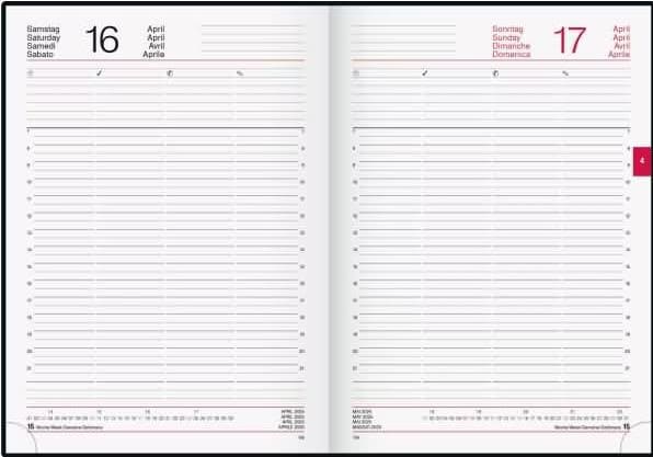 Jede Woche auf zwei Seiten übersichtlich dargestellt: links das Kalendarium mit 5 Spalten, rechts liniert für Notizen. Mit Wire-O-Bindung bleibt das Buch immer flach liegen. Der goldfarbene Glanzkarton-Einband sieht dabei richtig stylisch aus.