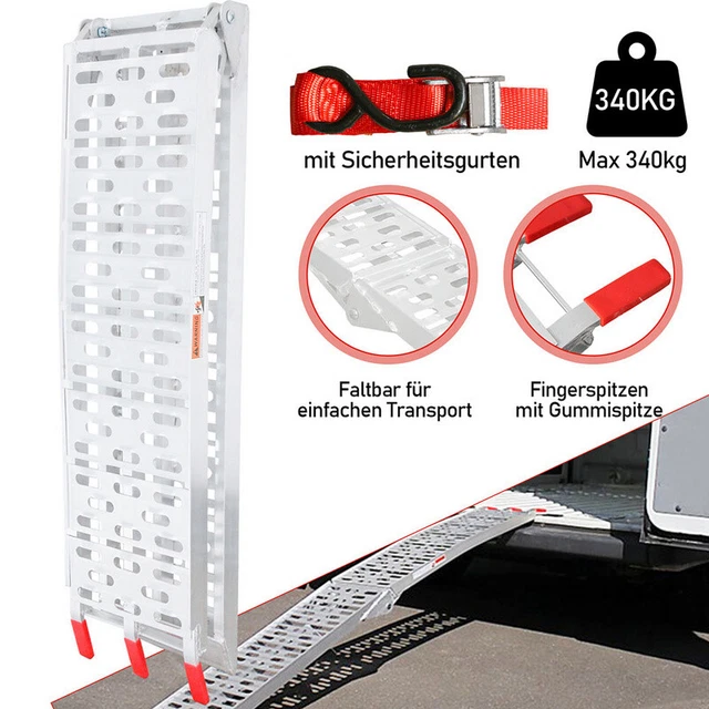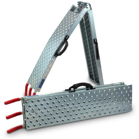 Schwere Lasten einfach verladen! Diese robusten Stahlrampen machen das Beladen deines Anhängers oder Transporters zum Kinderspiel. Jede Rampe trägt als Verladerampe 250kg und als Wartungsrampe sogar 1100kg! Ausgeklappt sind sie 200cm lang und bieten eine angenehme Auffahrt. Die praktische Klappfunktion reduziert die Transportlänge auf nur 58cm - platzsparend in jeder Garage. Mit Tragegriff und stoppsicheren Enden für maximale Sicherheit. Perfekt für Motorräder, Rasenmäher, Roller oder kleine Baumaschinen. Auch ideal für Wartungsarbeiten an Fahrzeugen. Deutsche Qualität zum fairen Preis - darauf kannst du dich verlassen!