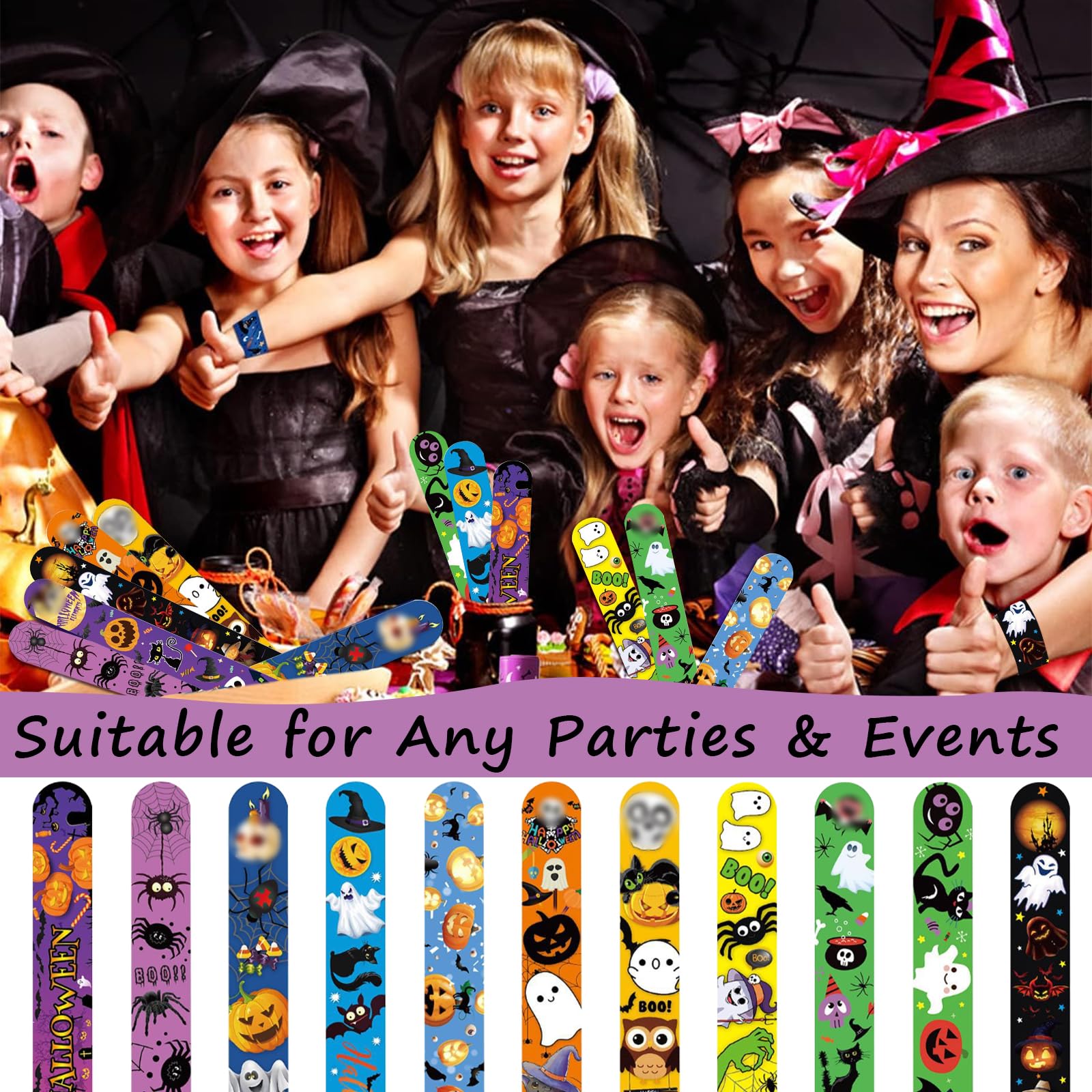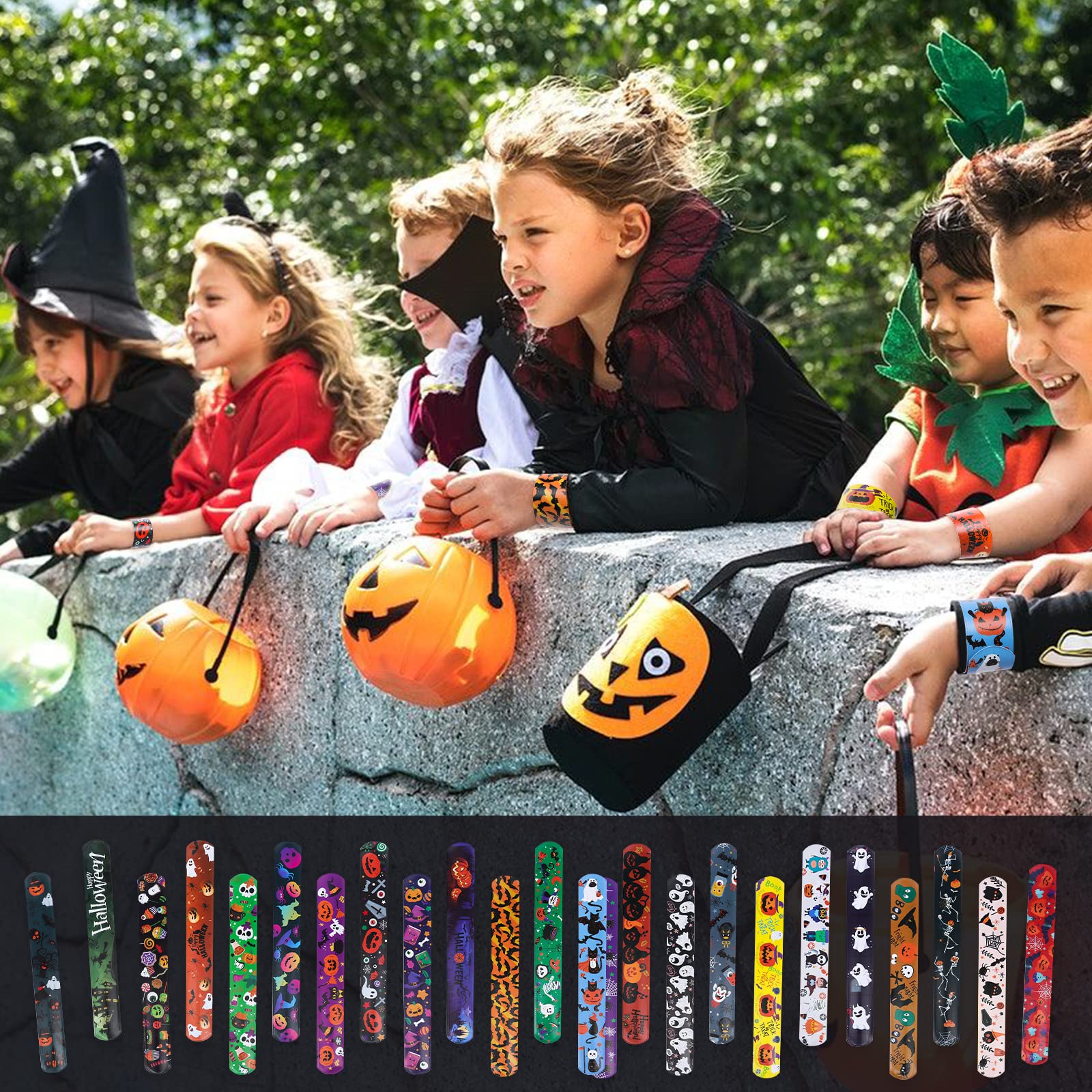 Der Hit auf jeder Halloween-Party! Diese 24 bunten Schnapparmbänder begeistern kleine und große Gruselfans. Einfach ums Handgelenk schnappen - schon ist das coole Accessoire fertig angelegt. Mit 12 verschiedenen Halloween-Motiven: von gruseligen Geistern über kichernde Kürbisse bis zu flatternden Fledermäusen. Das weiche PVC-Material ist hautfreundlich und die eingearbeiteten Metallstreifen garantieren lange Haltbarkeit. Perfekt als: Party-Mitgebsel, Süßigkeiten-Ersatz, Spielzeug oder Deko für die Halloween-Feier. Die Armbänder lassen sich immer wieder verwenden und machen auch nach der Party noch Freude. Großes Packungsinhalt - genug für die ganze Kindergruppe!