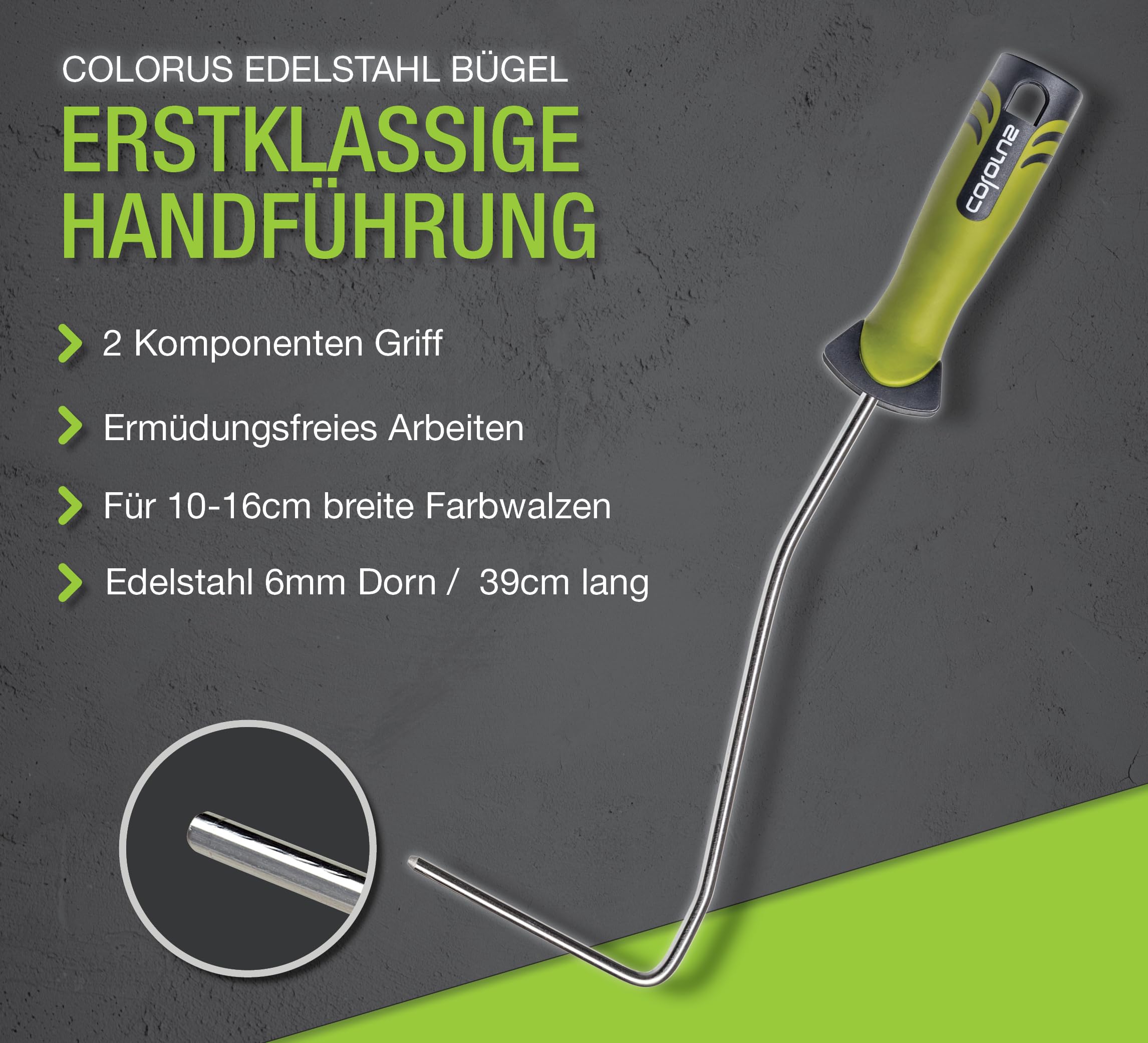 Professionelles Malerzubehör für perfekte Streichergebnisse! Dieser hochwertige Farbwalzenbügel aus rostfreiem Edelstahl ist der ideale Partner für deine Malerarbeiten. Passt perfekt für 25-27 cm Farbroller mit 8 mm Walzenlager - also für alle handelsüblichen Großwalzen. Der große Vorteil von Edelstahl: Kein lästiges Einrosten und damit keine Rostflecken in deiner frischen Farbe! Der ergonomische 2-Komponenten-Griff liegt super angenehm in der Hand und ist rutschfest - auch bei nassen Händen. Kompatibel mit allen gängigen Teleskopstangen, sodass du auch Decken und hohe Wände bequem streichen kannst. Ob Renovierung, Neubau oder malerische Verschönerung - mit diesem Qualitätsbügel machst du alles richtig. Einmal investieren, jahrelang verwenden!