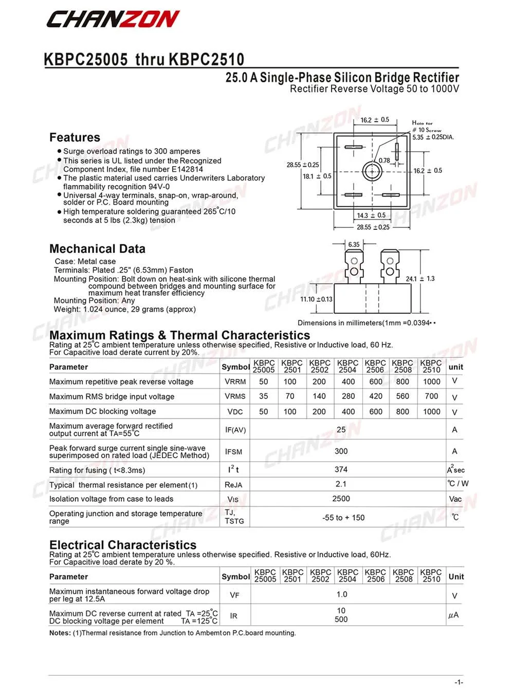 Brückengleichrichter KBPC 2510 - 1000 Volt Für Elektro-Projekte
