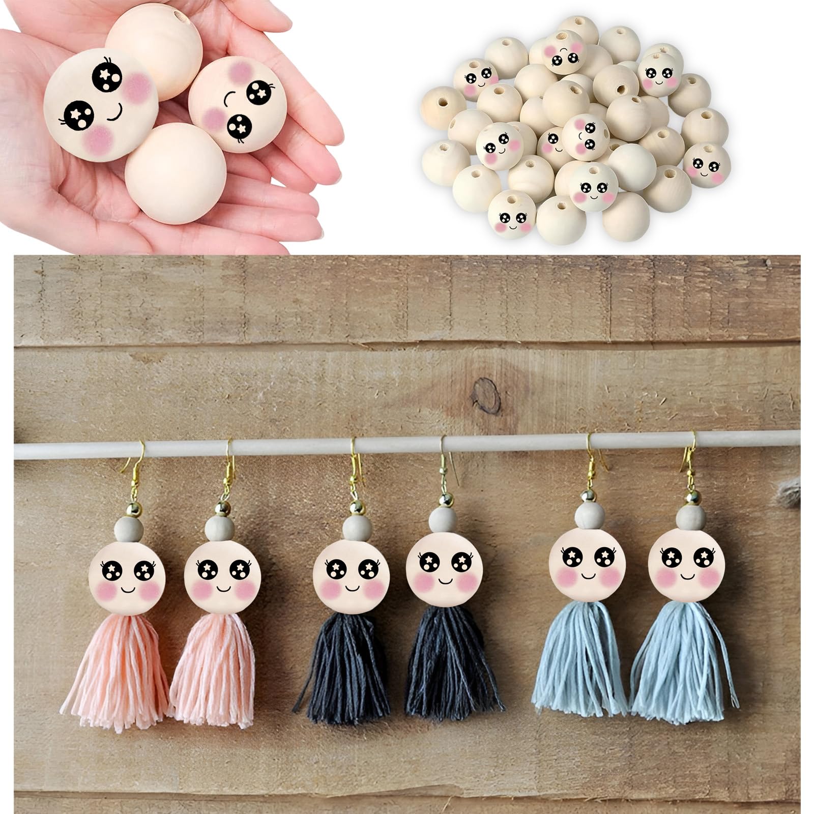 30 Stück Holzperlen Mit Gesichtern - 25mm Für Sorgenwurm & DIY Schmuck, Bunt Gemischt