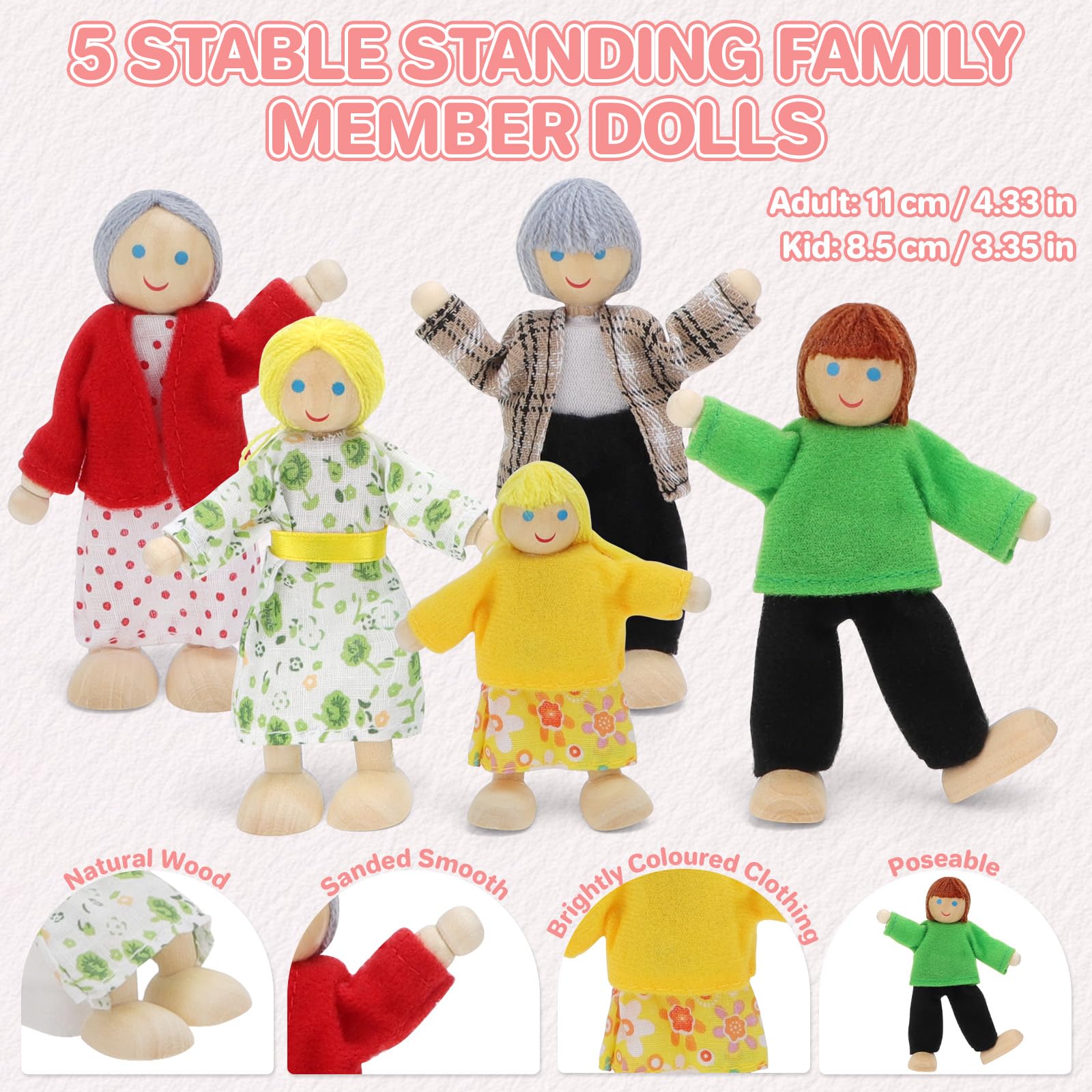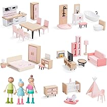 DeAO Puppenhaus Möbel Set - 27-teiliges Holz Spielzeug Mit 5 Puppen