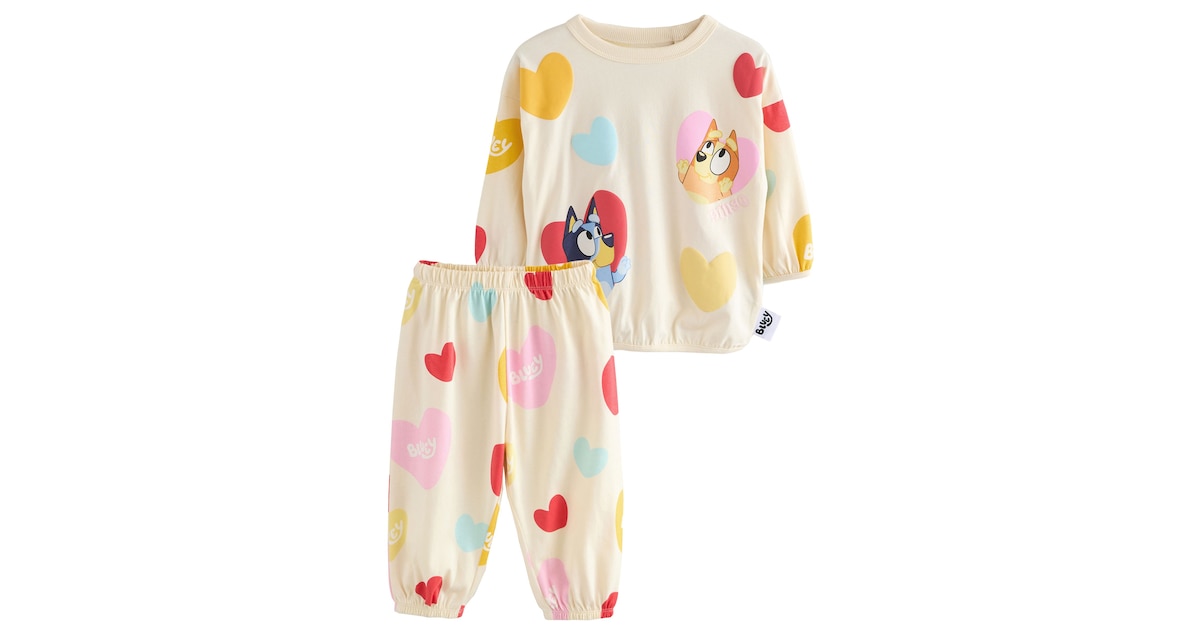 Oh wie niedlich! Dein Kind wird diesen Bluey Schlafanzug lieben! Im 2er-Pack bekommst du gleich zwei super süße Pyjamas mit dem beliebten Bluey-Motiv.\n\nHergestellt aus 100% Baumwolle - weich, atmungsaktiv und super angenehm auf der Haut. Perfekt für eine gute Nachtruhe, ohne dass dein Kind schwitzt oder friert.\n\nDas Set besteht aus einem langärmligen Shirt und einer elastischen Hose - bequem und praktisch. Das blaue Design mit den niedlichen Bluey-Charakteren bringt Freude ins Kinderzimmer.\n\nPflege? Ganz easy! Einfach bei 40°C in der Maschine waschen, mit niedriger Hitze trocknen und bei mittlerer Stufe bügeln. Kein Bleichen, keine chemische Reinigung nötig.\n\nWas ich besonders gut finde: Die Qualität von NEXT ist super - die Nähte halten, die Farben bleichen nicht aus und der Stoff wird auch nach häufigem Waschen nicht hart.\n\nPerfekt für kleine Bluey-Fans, die ihren Lieblingscharakter auch nachts um sich haben wollen. Ob zum Schlafen, Kuscheln oder gemütlichen Fernsehabenden - dieser Pyjama ist immer die richtige Wahl!\n\nMach deinem Kind eine Freude und sorg für süße Träume mit diesem bezaubernden Bluey Schlafanzug-Set!