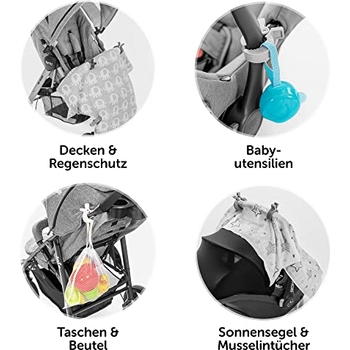 Kennst du das? Beim Einkaufen mit dem Kinderwagen weißt du nicht, wo du all die Taschen unterbringen sollst? Diese praktischen Kinderwagen-Haken lösen das Problem! Im 2er Pack bekommst du zwei super-stabile Clips, die an fast jedem Kinderwagen befestigt werden können. Kompatibel mit Uppababy, Babyzen Yoyo, Britax, Bugaboo, Bob und vielen mehr! Die Polyesterschlaufe ist 6,3 Zoll lang und 0,8 Zoll breit - passt also an die meisten Griffe. Der Karabiner selbst misst 3 Zoll und hält bis zu 50lbs - da kannst du getrost deine Einkaufstaschen, Handtasche oder Jacke aufhängen! Mit der Drehsperre bleibt alles sicher an Ort und Stelle, selbst auf holprigen Wegen. Die Installation ist kinderleicht: Schlaufe durch den Karabiner wickeln, festziehen - fertig! Und wenn du mal keine Taschen zu transportieren hast, lassen sich die Haken einfach abnehmen. Übrigens: Die Haken sind nicht nur für Kinderwagen super - auch am Fahrrad, im Auto oder an der Babytrage machen sie eine gute Figur! Endlich freie Hände beim Spaziergang - was will man mehr?