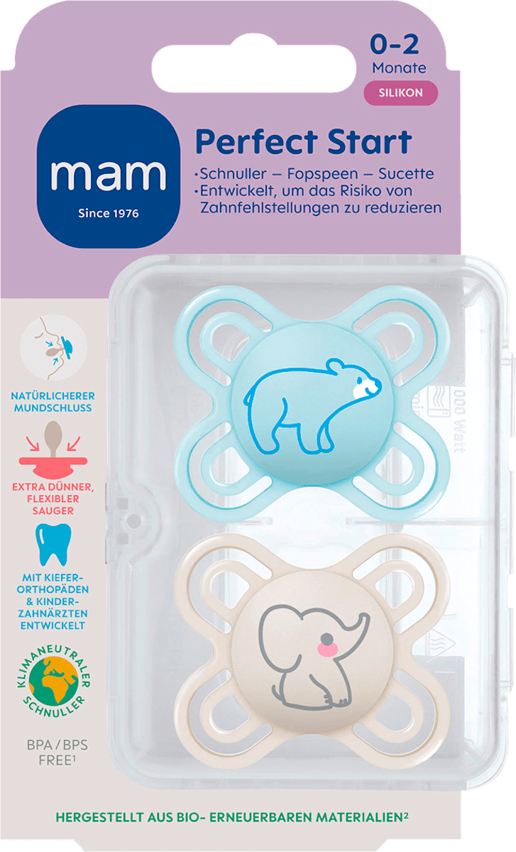 Beruhigung mit gutem Gewissen! Das MAM Original Schnuller-Set bietet zwei kiefergerechte Schnuller für Kleinkinder ab 16 Monaten. Aus hautfreundlichem SkinSoft Silikon das sich besonders weich anfühlt - von 94% der Kinder instinktiv akzeptiert! Symmetrisches, flaches Saugteil wurde mit Zahnmedizinern entwickelt. Schild mit Luftlöchern und Noppen ist extra sanft zur Babyhaut. Aus nachhaltigen, bio-erneuerbaren Materialien - klimaneutral produziert! Inklusive praktischer Sterilisierbox für Mikrowelle - spart 77% Energie und CO₂. BPA/BPS-frei, entspricht EN 1400. Farbkombination blau/hellblau. Einfache Reinigung, hygienische Aufbewahrung. Der meistverkaufte MAM Schnuller - jetzt im praktischen 2er-Pack!