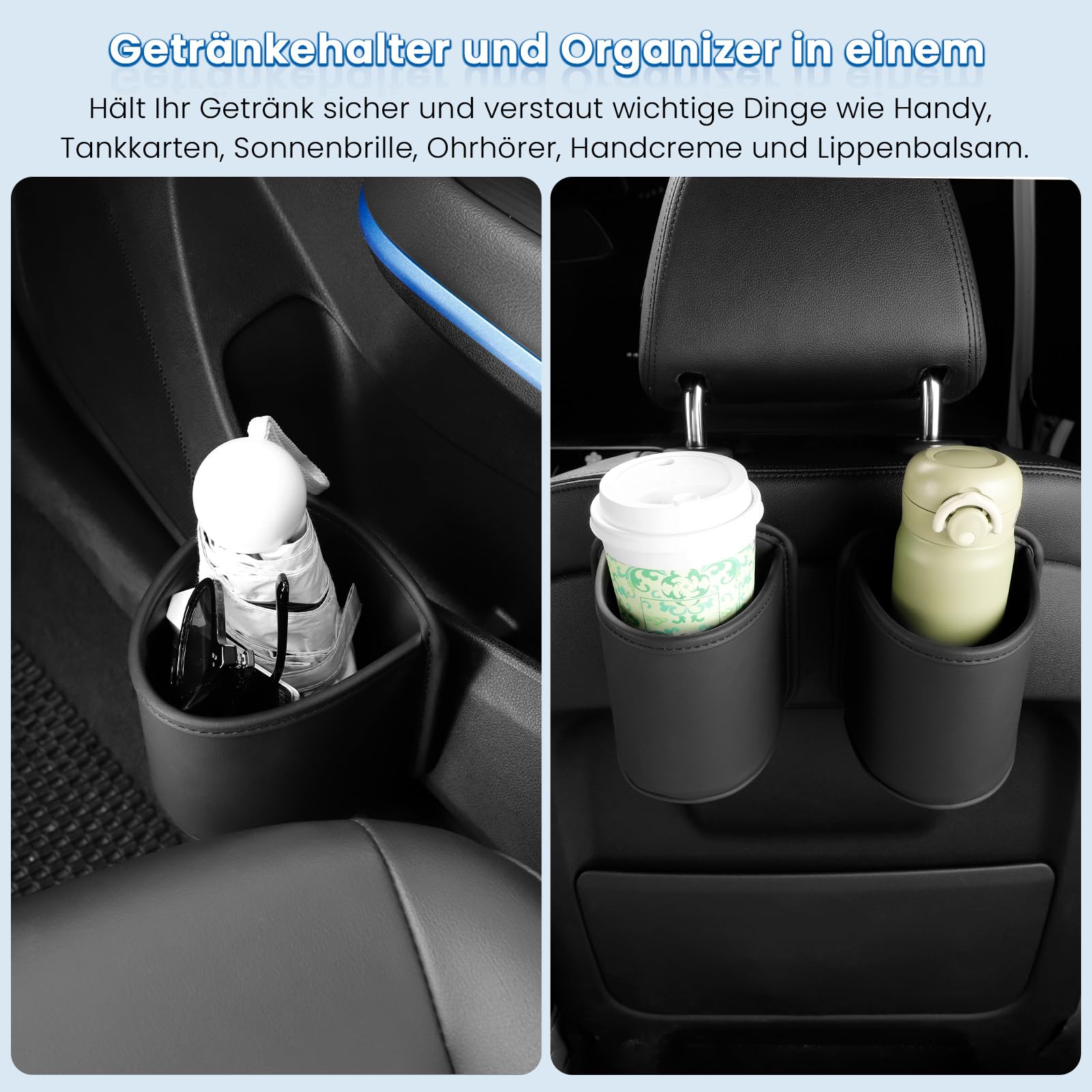 Schluss mit wackelnden Getränken im Auto! Diese praktischen Getränkehalter clipst du einfach an deine Autotürtasche - kein Bohren, kein Kleben, kein Stress. Aus robustem PU-Leder, wasserabweisend und leicht zu reinigen. Mit 9cm Innendurchmesser und 12cm Tiefe halten sie sicher alle Standard-Getränke. Der Metallclip sorgt für bombenfesten Halt, selbst auf holprigen Straßen. Aber wusstest du, dass du sie auch als Mini-Aufbewahrung für Handy, Sonnenbrille oder sogar als Mülleimer nutzen kannst? Im 2er-Set - für Fahrer und Beifahrer. Endlich Ordnung im Auto!
