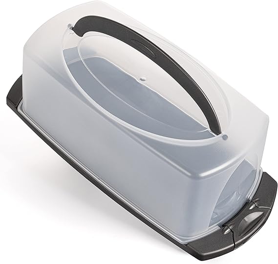 Perfekt für alle, die ihre selbstgemachten Kuchen und Torten sicher transportieren möchten! Die Novaliv Transportbox ist made in Germany und aus BPA-freiem, lebensmittelechtem Kunststoff. Mit den Maßen 39 x 17 x 14 cm bietet sie genug Platz für runde Sahnetorten oder eckige Blechkuchen. Der sichere Klickverschluss hält Haube und Platte fest zusammen, und der erhöhte Rand verhindert das Verrutschen der Torte. Kristallklar zeigt die Haube dein Backwerk von seiner besten Seite. Super praktisch: Die Box ist spülmaschinengeeignet, verfärbt sich nicht und nimmt keine Gerüche an. Ob für Geburtstage, Gartenpartys oder Buffets - deine Torte kommt immer perfekt an! Ein echter Begleiter für Hobbybäcker und Profis.
