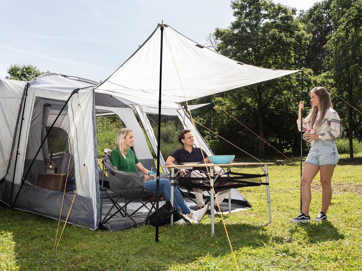 Hey Outdoor-Fans! Diese Teleskopstangen von Skandika sind echte Alleskönner. Ob für's Camping, Gartenfest oder Balkon - damit machst du aus jeder Plane im Nu ein cooles Sonnendach oder Vorzelt.\n\nEinfach ausziehen, drehen - schon steht die Stange bombenfest! Von 86,5cm bis 227cm stufenlos verstellbar, da findest du für jede Situation die passige Höhe. Und das Beste: Jede Stange trägt bis zu 20kg - richtig stabil!\n\nAus eloxiertem Aluminium, also rostfrei und witterungsfest. Die Ösen oben sind super praktisch für Abspannleinen (Seile bitte separat besorgen). Und die Kunststoffkappen schützen nicht nur vor Regen, sondern auch vor Blitzen - safety first!\n\nPerfekt für: Sonnensegel, Tarps, Zelte, Markisen oder als Wäscheleine wenn's mal geregnet hat. Zusammengeschoben nur 98cm lang und leicht - passt in jeden Kofferraum. Inklusive Tragetasche für unterwegs.\n\nMaße: 86,5-227cm verstellbar \nMaterial: Eloxiertes Aluminium \nBelastbarkeit: 20kg pro Stange \nFarbe: Schwarz \nGewicht: Nur 1kg für beide Stangen\n\nEinfach unverzichtbar für jeden Outdoor-Trip!