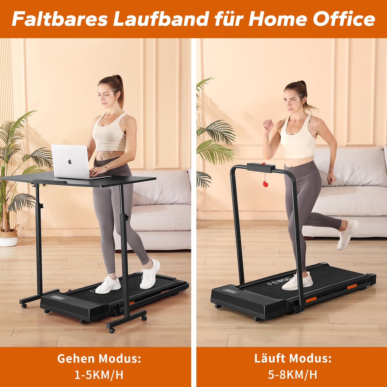 Dieses vielseitige 2-in-1 Laufband von BestGod macht Fitness zu Hause zum Vergnügen! Klappbar und mit Rädern ausgestattet, lässt es sich platzsparend unter dem Sofa verstauen. Der leistungsstarke 2,5PS-Motor erreicht Geschwindigkeiten bis 8km/h und trägt bis zu 150kg. Besonders praktisch: Die verstellbaren Handläufe machen es zum vollwertigen Laufband oder zum platzsparenden Walking Pad unter dem Schreibtisch. Die 5% Steigung simuliert leichte Anstiege und intensiviert dein Training. 6 Stoßdämpfer und ein 5-lagiger Anti-Rutsch-Gürtel schützen deine Gelenke und sorgen für sicheres Training. Die LED-Anzeige zeigt Zeit, Kalorien, Geschwindigkeit und Distanz in Echtzeit an. Mit weniger als 45dB läuft das Laufband superleise - ideal für Wohnungen und Büros. Drei Trainingsmodi: Gehen (1-3km/h), Joggen (3-5km/h), Laufen (6-8km/h). Der perfekte Fitness-Partner für jedes Zuhause!